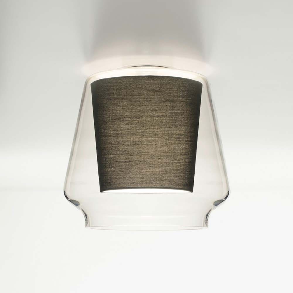 Le plafonnier Casablanca Aleve en verre transparent se compose de deux abat-jour, un abat-jour extérieur en verre soufflé bouche de haute qualité, disponible en verre transparent ou en verre fumé, et un abat-jour intérieur en tissu, disponible en blanc ou anthracite. La lampe impressionne par sa forme particulière et ses matériaux et couleurs neutres.
