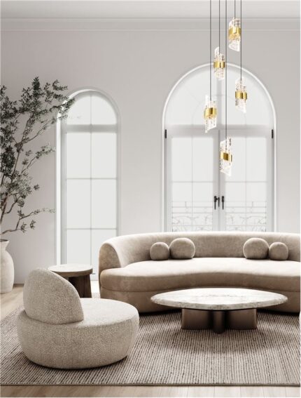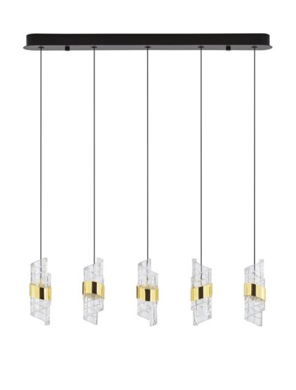 La suspension Seneca 5 lampes associe une esthétique contemporaine à des finitions raffinées. Cinq abat-jour en acrylique transparent au délicat