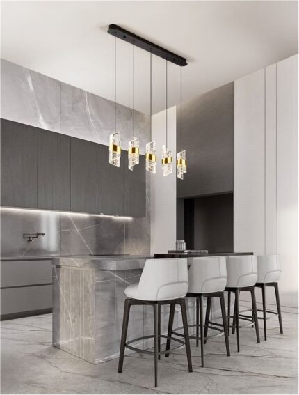 La Seneca au format barre conjugue ligne contemporaine et raffinement. Cinq abat-jour en acrylique transparent, subtilement texturés comme un verre