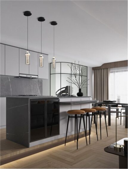 La suspension BIOS associe un métal noir mat à un élégant verre fumé pour créer un éclairage moderne et chaleureux