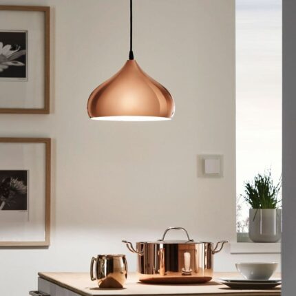 La suspension Hapton Vintage couleur cuivre, une suspension noble en acier par Eglo. La lampe simple et courbée en finition
