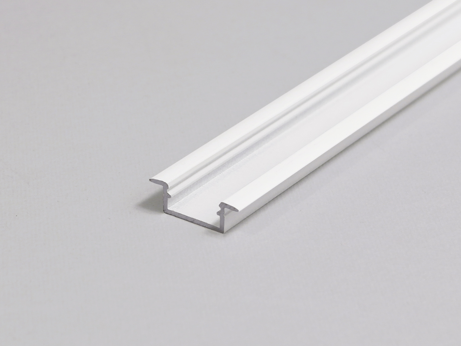 Il est idéal pour le montage sur rainure, mais aussi pour un montage libre sur des surfaces murales ou au plafond. Le profil d’installation plat pour bandes LED jusqu’à 12 mm de large est bien adapté pour une installation dans des murs plats. Il est disponible en longueurs de 100 cm et 200 cm.