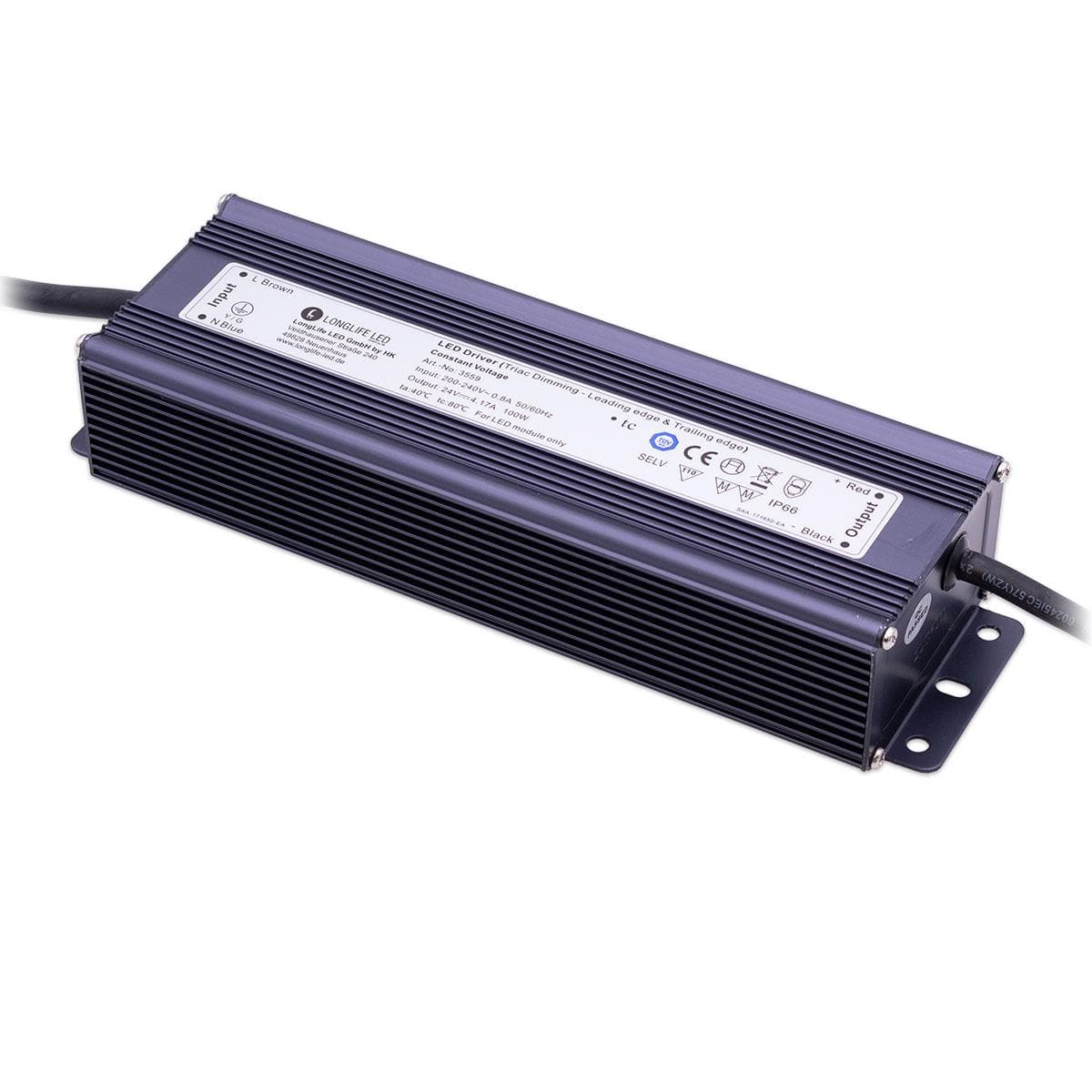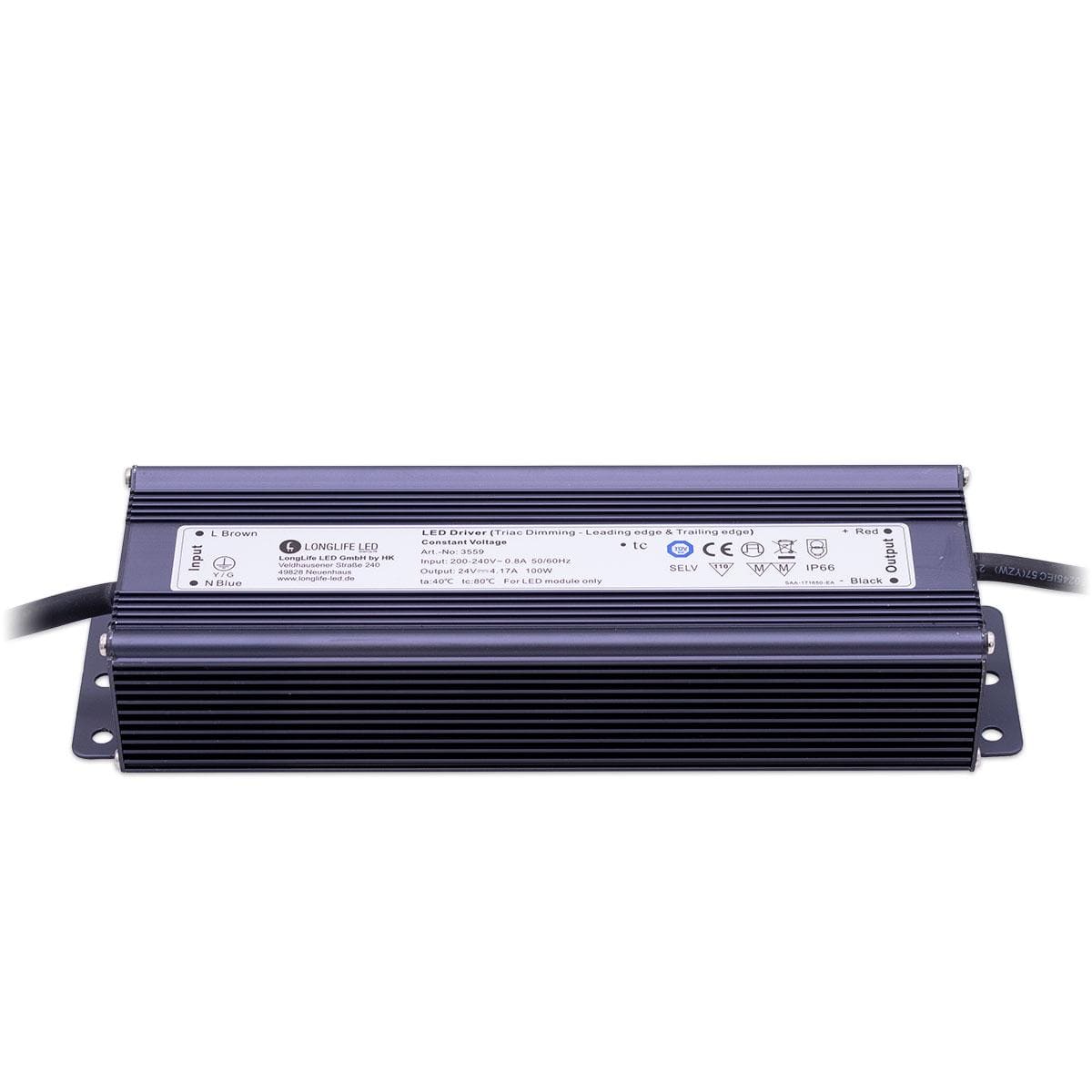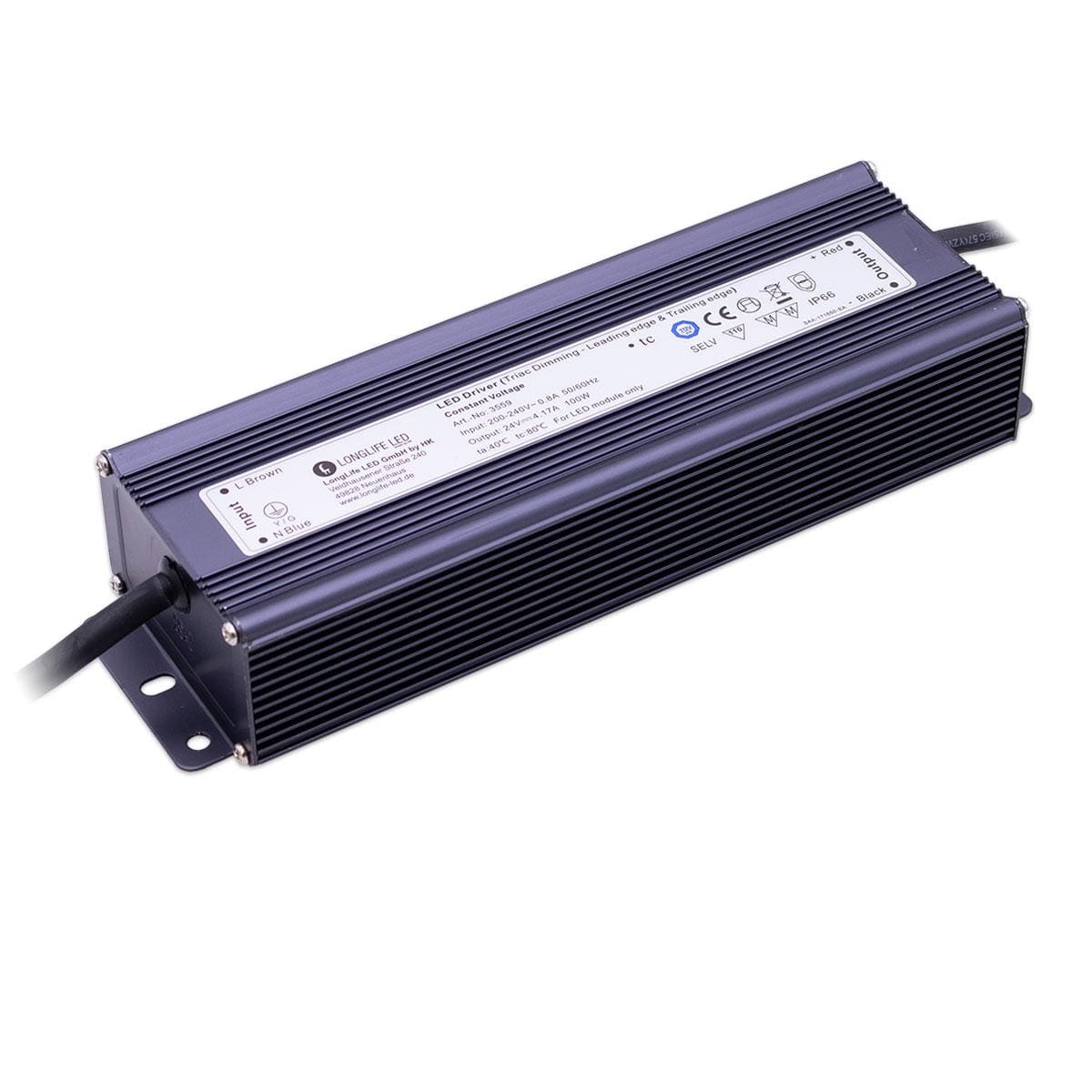 Einbaunetzteil 100W 24V IP65 dimmbar für LED Streifen ohmscher Standard-/Drehdimmer: 25-100% Universaldimmer : 25-100% Phasenabschnitt: 30 – 100%, benötigt eine