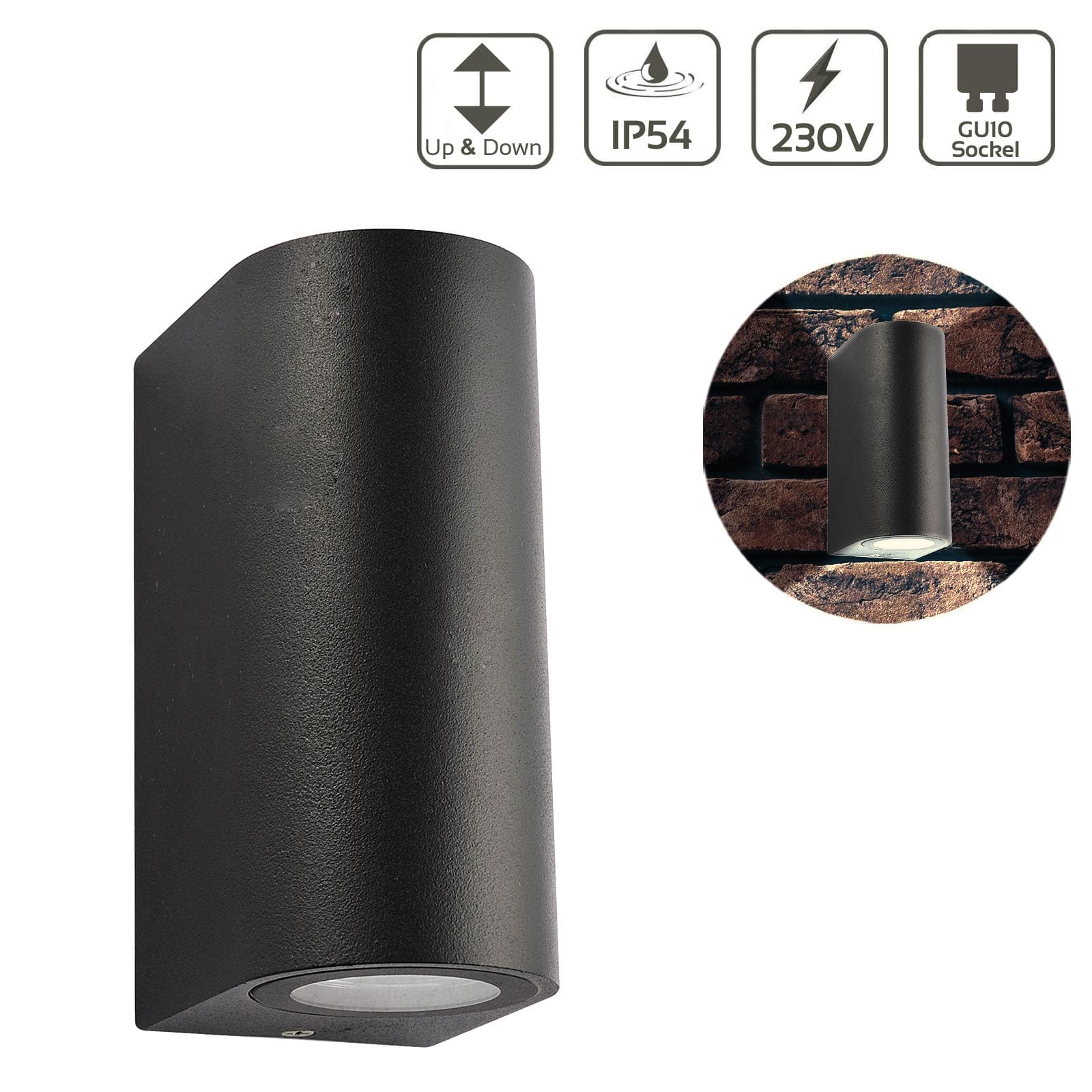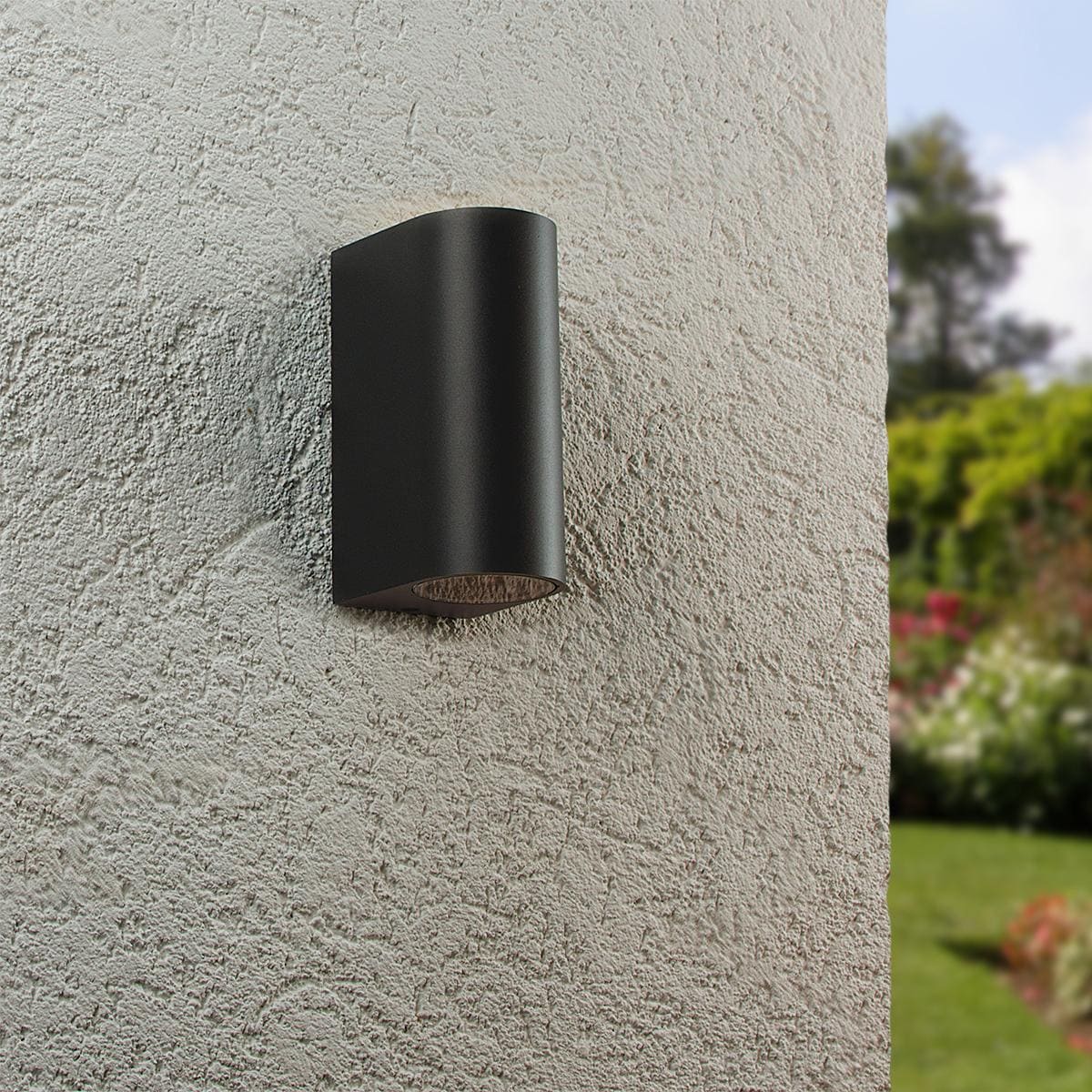 Diese stilvolle Wandleuchte aus wetterfestem Aluminium in edlem Anthrazit sorgt mit ihrem doppelten Lichtaustritt nach oben und unten (Up & Down) für effektvolle Beleuchtung an Hausfassaden oder im Innenbereich. Die beiden GU10-Leuchtmittel sind nicht im Lieferumfang enthalten, sodass Sie die Lichtfarbe (warmweiß, neutralweiß, kaltweiß oder RGB) sowie Helligkeit und Wattzahl individuell wählen können.