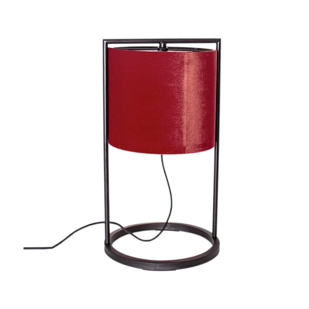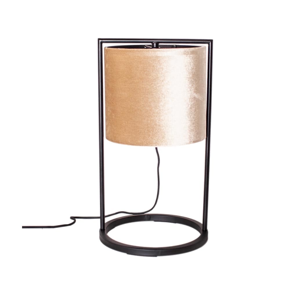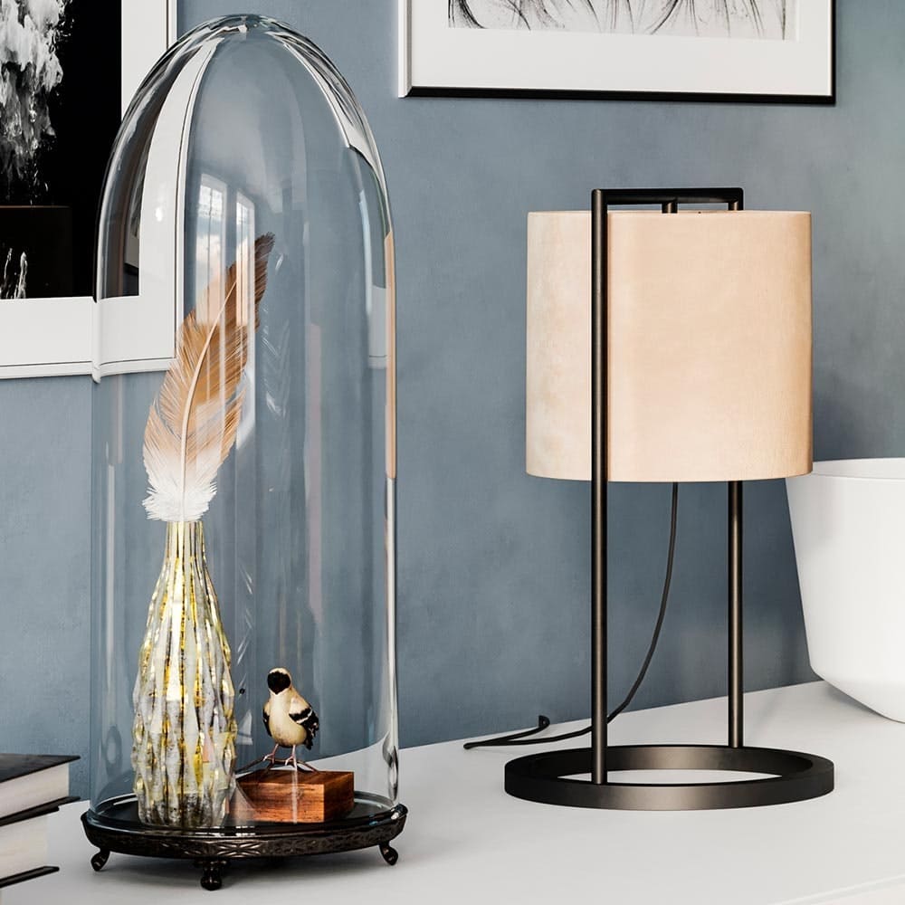 By Rydens Vieste Tischleuchte 45 cm Samtschirm ist eine moderne Tischleuchte mit einer mattschwarzen Metallstruktur und einem geraden, runden Samtschirm.