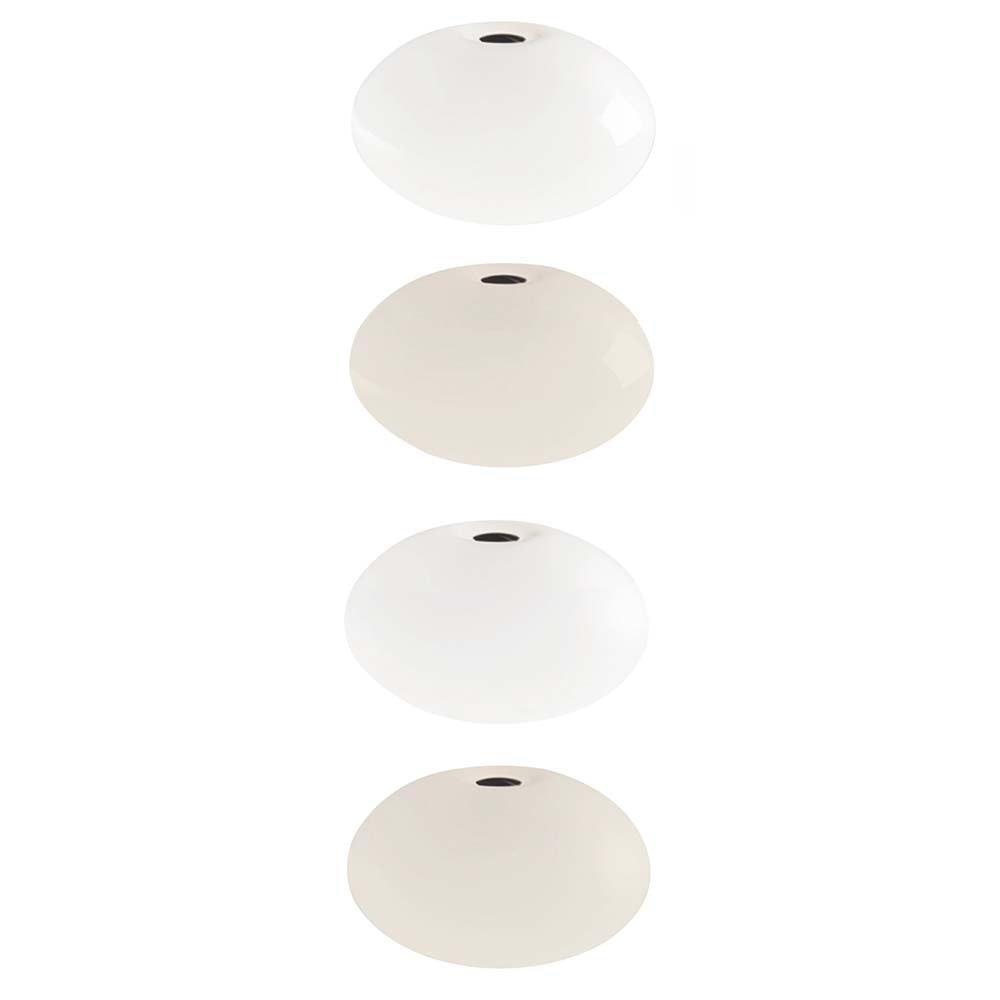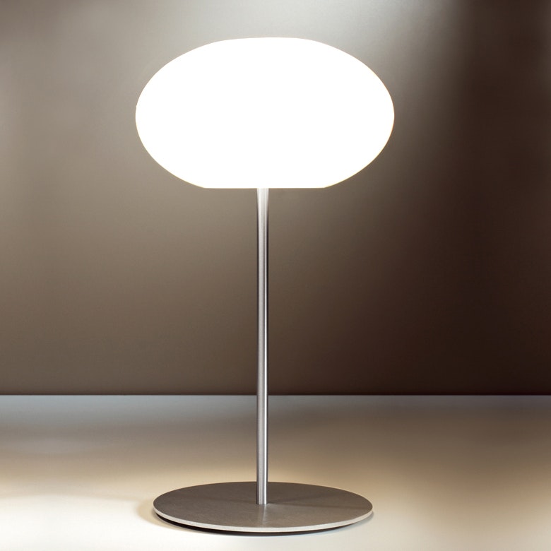 Der Leuchtenstab wie auch der runde Standfuß sind aus handgebürstetem Aluminium, der Schirm ist aus mundgeblasenem Glas, das wahlweise in Weiß glänzend und Weiß matt erhältlich ist. Die Leuchtmittel sind nicht im Lieferumfang enthalten.