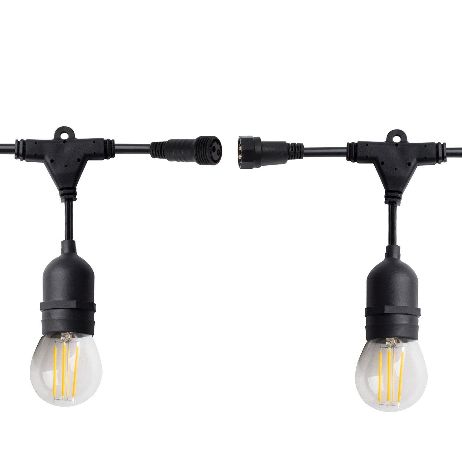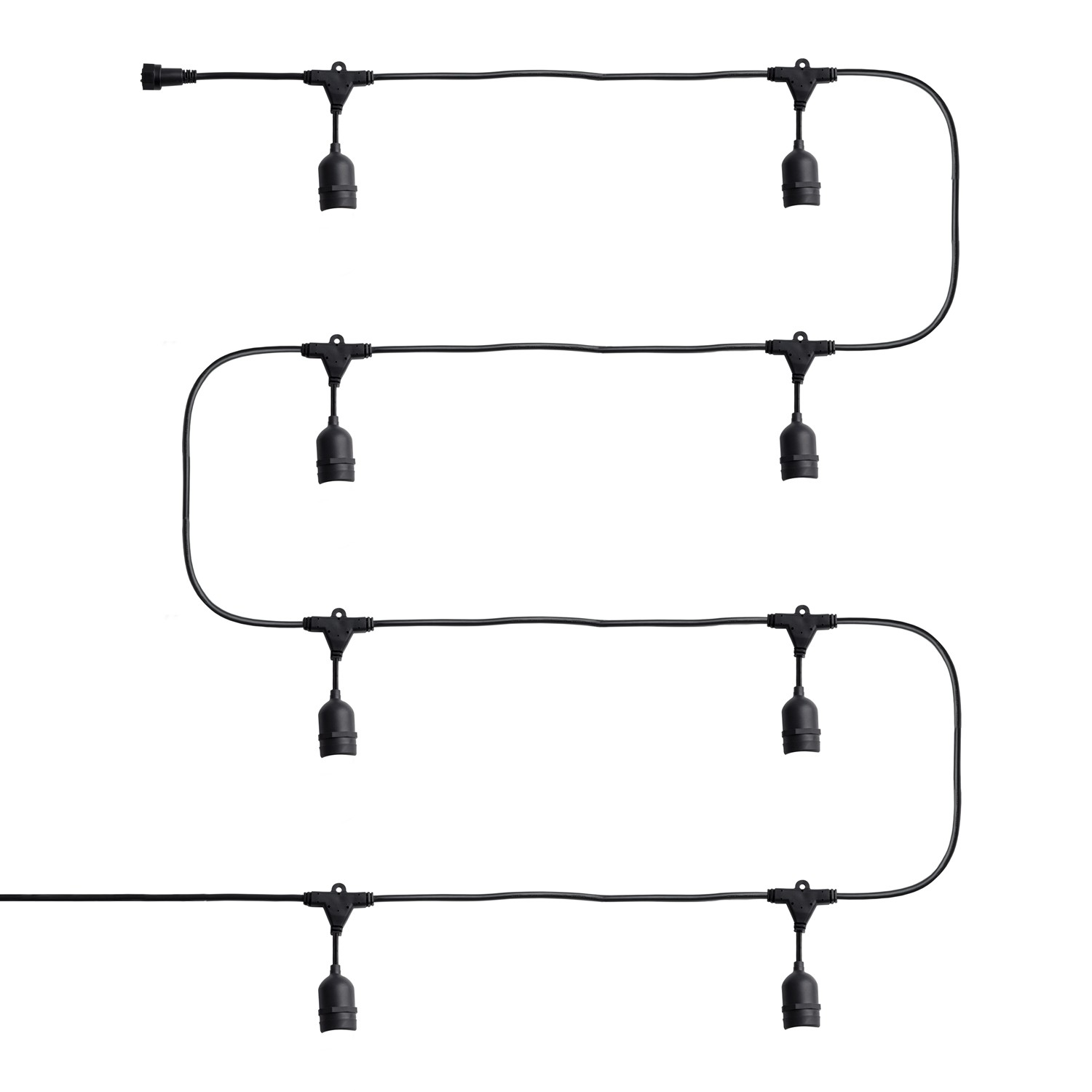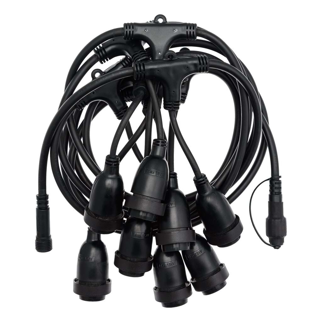 Girlande Waterproof mit 8 Lampenfassungen E27 5.5m Schwarz: Diese Girlande Waterproof IP 65 5,5m lang und 8 Lampenfassungen E27 ist ein weit verbreitetes Bestandteil der dekorativen Beleuchtung von Außenräumen. Die Girlande hat an den Enden Anschlüsse, die sowohl für die Zuführung als auch für die Reihenschaltung von Girlanden verwendet werden können. Wir können bis zu 6 Girlanden zu einer Kette von 30 Metern Länge und 48 Glühbirnen zusammenfügen. Zwischen den Zwiebeln befindet sich jeweils eine Länge von 60 cm.