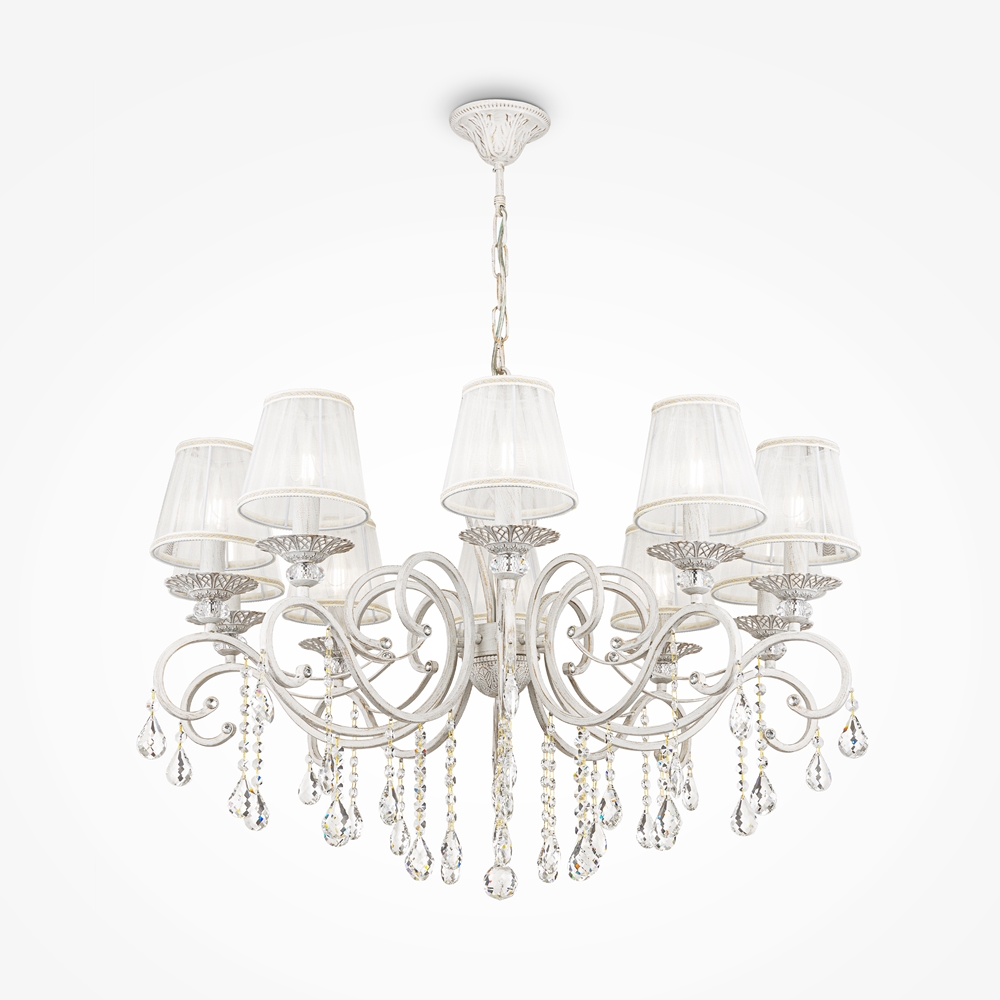 Der majestätische Kronleuchter Grace verleiht jedem Raum eine edle und luxuriöse Atmosphäre. Mit seinen zehn geschwungenen Armen, die von feinen Kristallanhängern geschmückt sind, entfaltet er ein prachtvolles Lichtspiel, das besonders in hohen Deckenräumen beeindruckt.