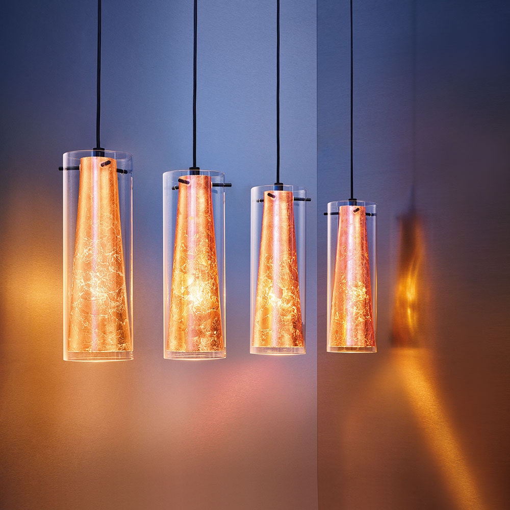 Die mehrflammige und moderne Hängeleuchte Belem aus hochwertigem Glas eignet sich ideal als Esstischbeleuchtung. Die vier Glasschirme beinhalten jeweils konische Zylinder in der Farbe Gold. Die Pendelleuchten-Konstellation ist insgesamt 90,5cm lang und 36cm breit.