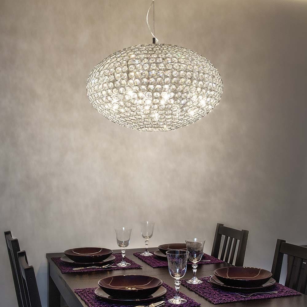 von Ideal Lux ist eine Pendelleuchte mit zeitgemäßem Design. Aufhängung bestehend aus Metallringen mit eingelassenen transparenten Kristallachtecken. Ein schlichter Kronleuchter in seinem Design, aber elegant in seiner Lichtleistung.