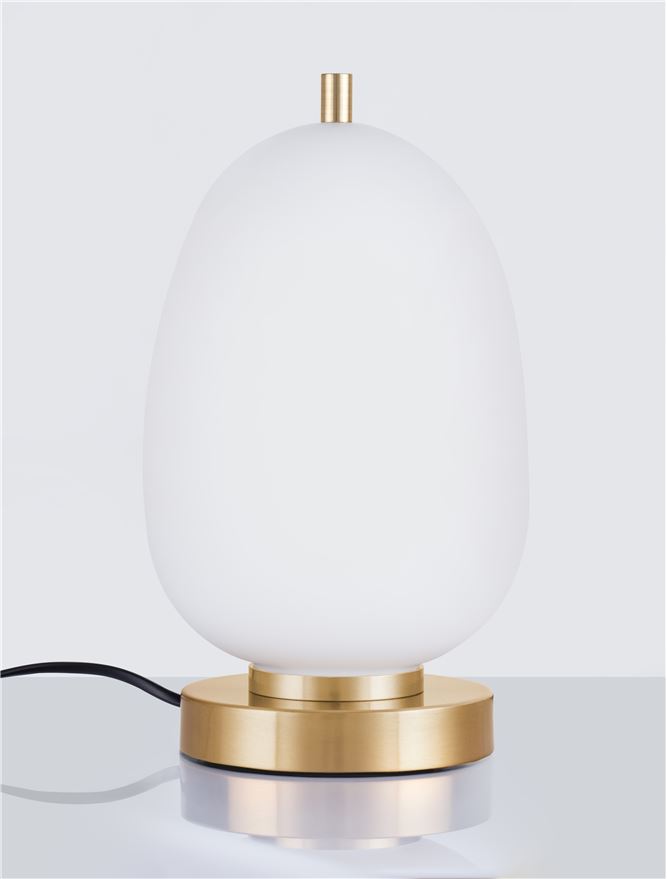 Die Tischleuchte LATO von Nova Luce bringt warmen Glanz und ruhige Eleganz auf Sideboard, Nachttisch oder Konsole. Die Kombination aus goldfarbener Metalloberfläche und opalweißem Glas wirkt hochwertig und zeitlos – ein dekoratives Highlight, das auch ausgeschaltet stilvoll bleibt.