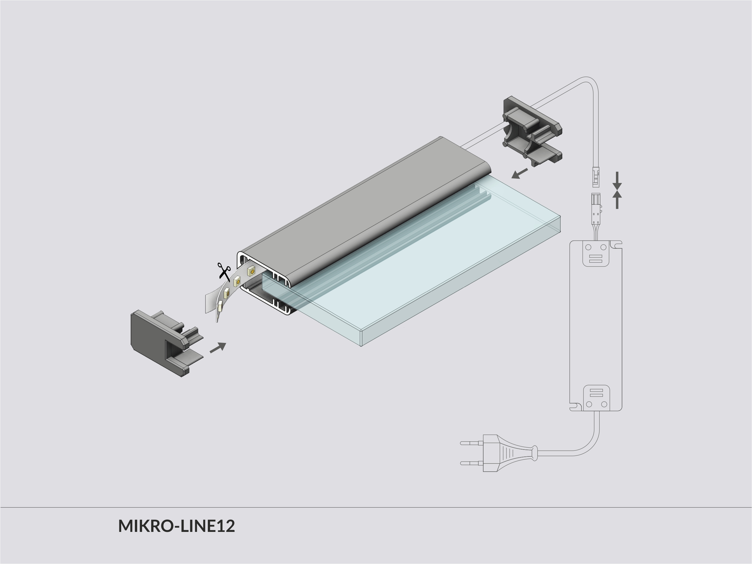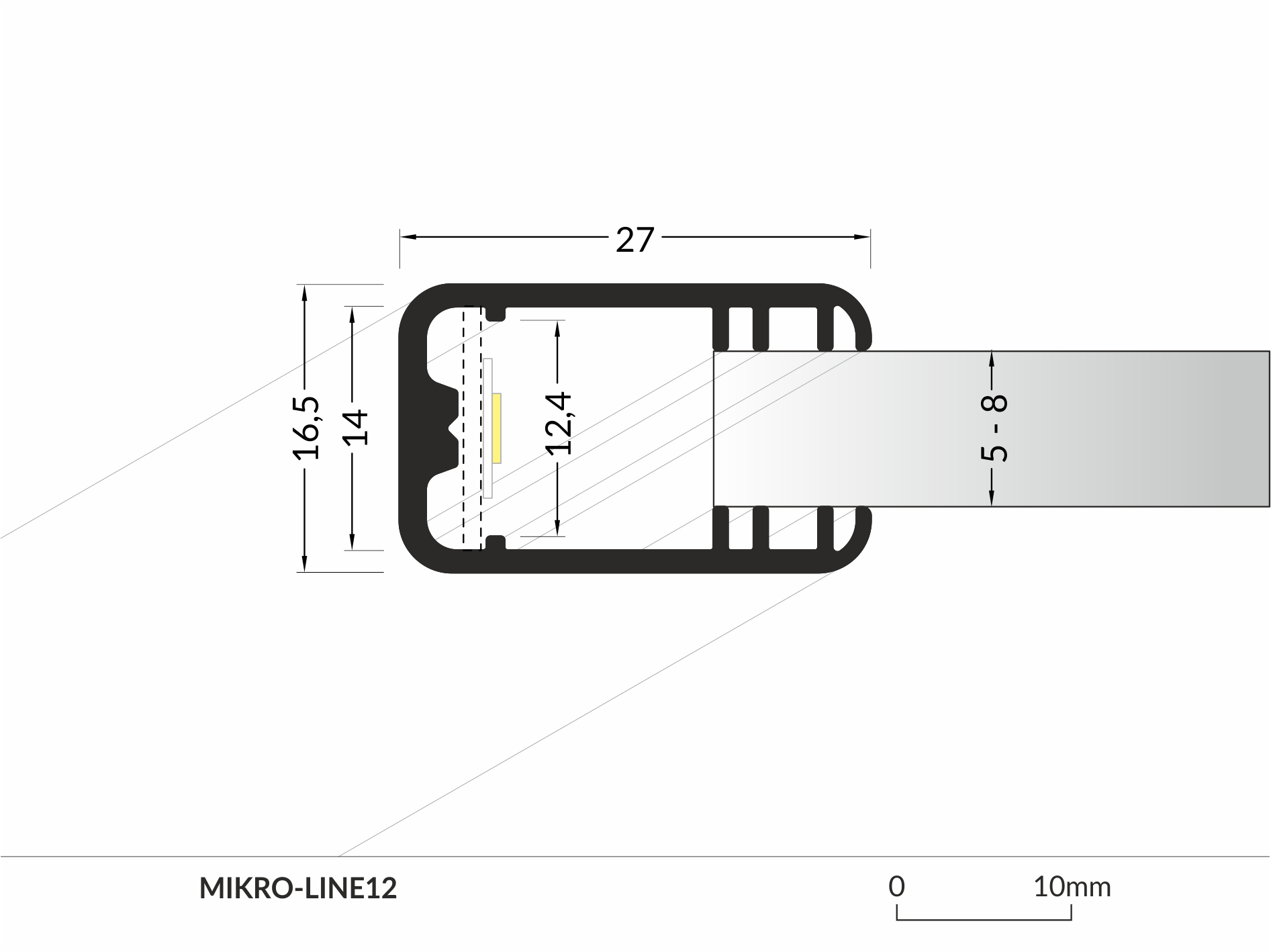 Diese LED Alu Profile Glaskantenprofil MIKRO-LINE12 2m mit einschiebbarer Abdeckung J für die indirekte Beleuchtung hat innen eine Breite von 12,4 mm und ist 1 oder 2 Meter lang.