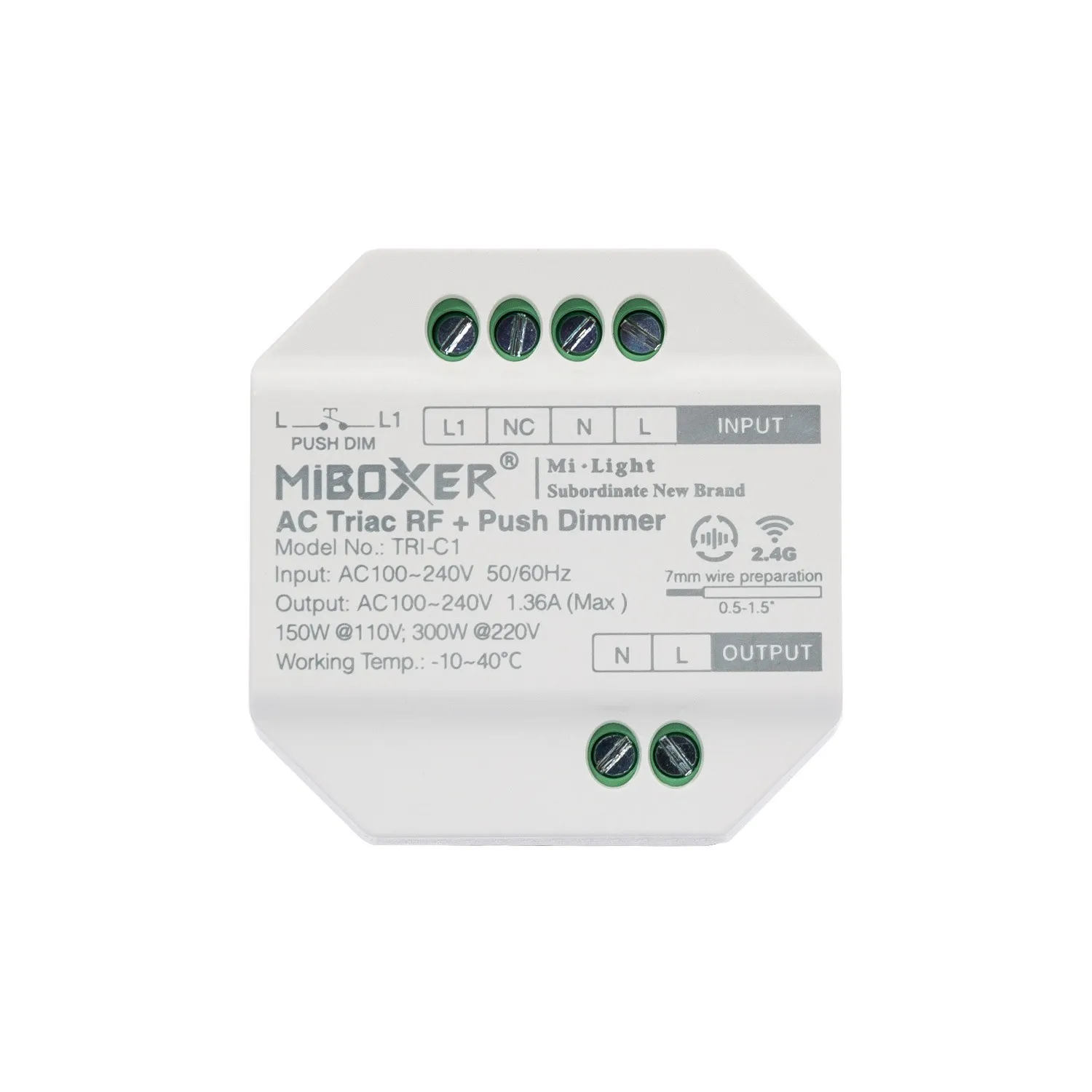 Er nutzt die Radiofrequenztechnologie und ist speziell für die Fernsteuerung von LED-Streifen konzipiert. Der TRIAC MiBoxer TRI-C1 LED-Dimmer TRI-C1 kann einfach hinter dem Taster oder in der Anschlussdose montiert werden, da er nur eine kleine Grundfläche hat. Der maximale Ausgangsstrom seines Kanals beträgt 1,5 A.