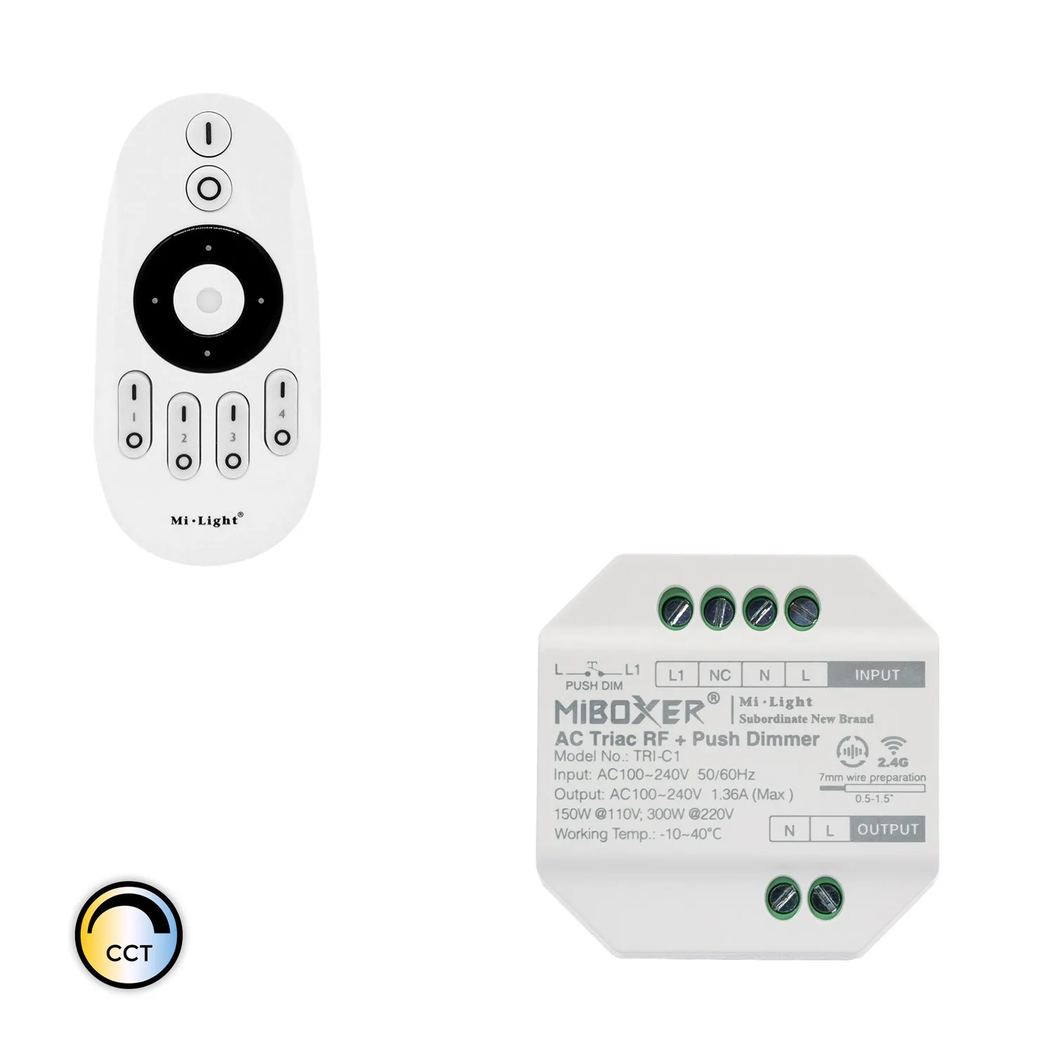 Der LED-Dimmer TRIAC + Fernbedienung RF CCT 4 Zonen MiBoxer ist ein Set bestehend aus einem Controller und einer Fernbedienung-RF CCT.