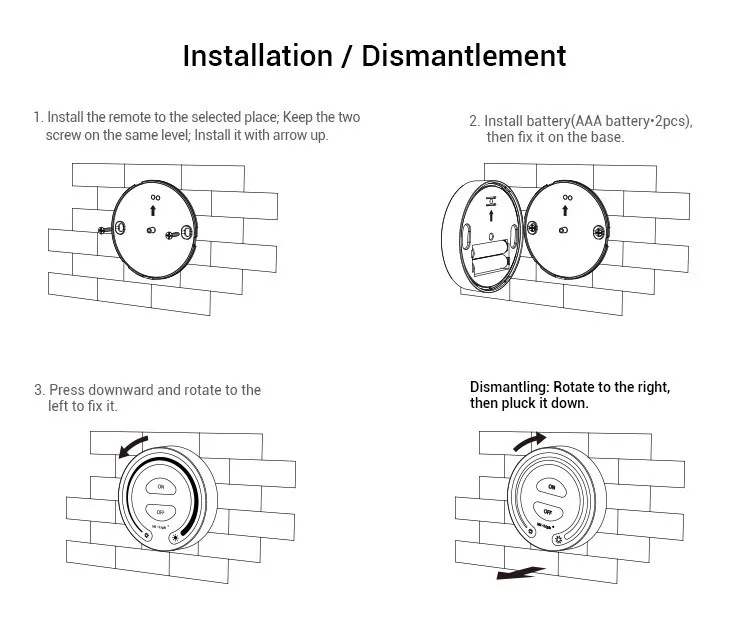 Sie nutzt die Radiofrequenztechnologie. Mit der ON/OFF-Taste können wir die Leuchte ein- und ausschalten und mit der Dimmertaste können wir die Helligkeit einstellen. Er benötigt nur 2 AAA-Batterien, die nicht im Lieferumfang enthalten sind. Es ermöglicht die Steuerung von Geräten mit einer Reichweite von bis zu 30 Metern.