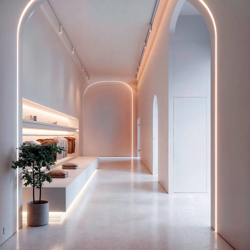 Diese flexiblen Einbauschläuche ermöglichen es, durch die Installation des LED-Streifens einen Neonlichteffekt zu erzeugen. Sie sind speziell dafür konzipiert, moderne Umgebungen mit indirektem, sanftem und edlem Licht zu beleuchten. Die matte Silikonhülle sorgt für eine angenehme, gleichmäßige Lichtstreuung und schafft einen attraktiven Neonlichteffekt.