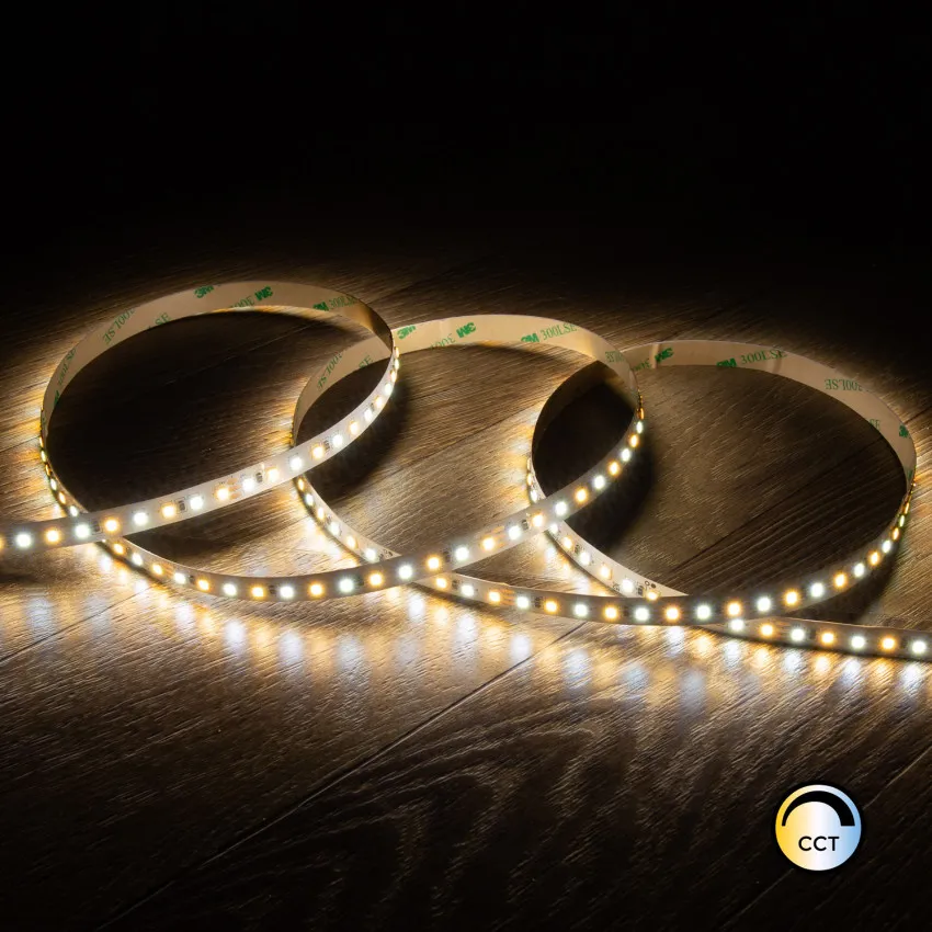 Der LED-Streifen CCT 24V DC SMD2835 10W/m 60LED/m 5m Breite 10mm Schnitt alle 5cm IP20 ist eine weit verbreitete Option für dekorative Beleuchtung mit sehr geringem Energieverbrauch. Sein flexibles Design passt sich jeder Umgebung an und verleiht ihr einen Hauch von Helligkeit.
