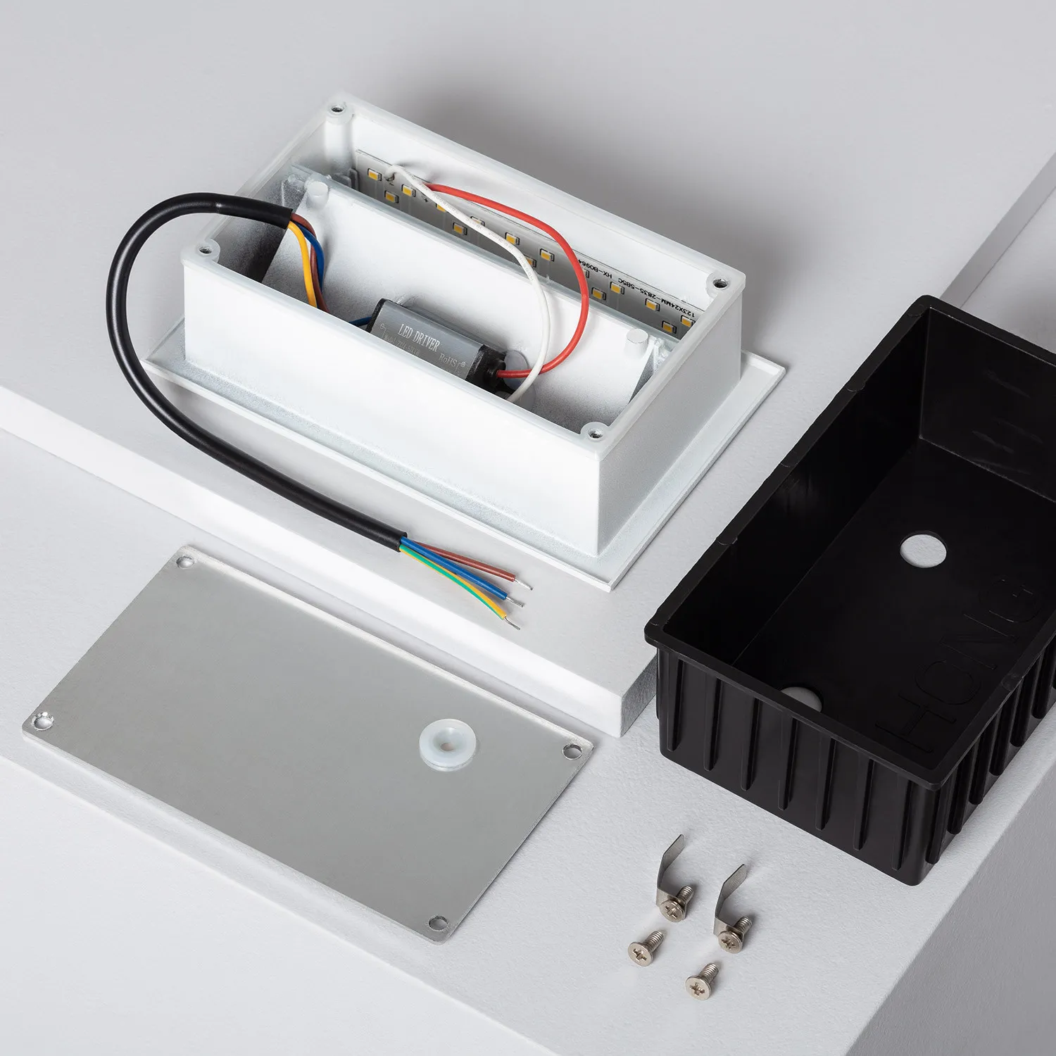 Eckige LED-Treppenbeleuchtung IP44 CCT 1,5W Schwarz Im Lieferumfang enthalten: Unterteil mit dem stromsparenden LED-Leuchtkörper Schwarzes Oberteil Abdichtring aus Kunststoff für