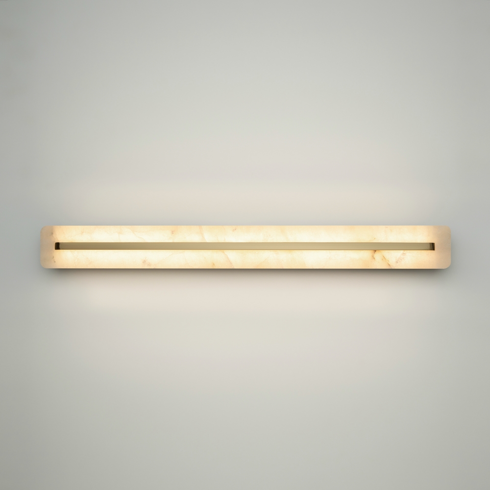Die Wandleuchte Albatre aus der Serie Modern vereint architektonische Klarheit mit der natürlichen Schönheit von Alabaster. Ihr schlankes Metallprofil aus satiniertem Messing zieht eine elegante Linie entlang der Wand, während der fein strukturierte Alabasterdiffusor das Licht sanft und gleichmäßig streut.