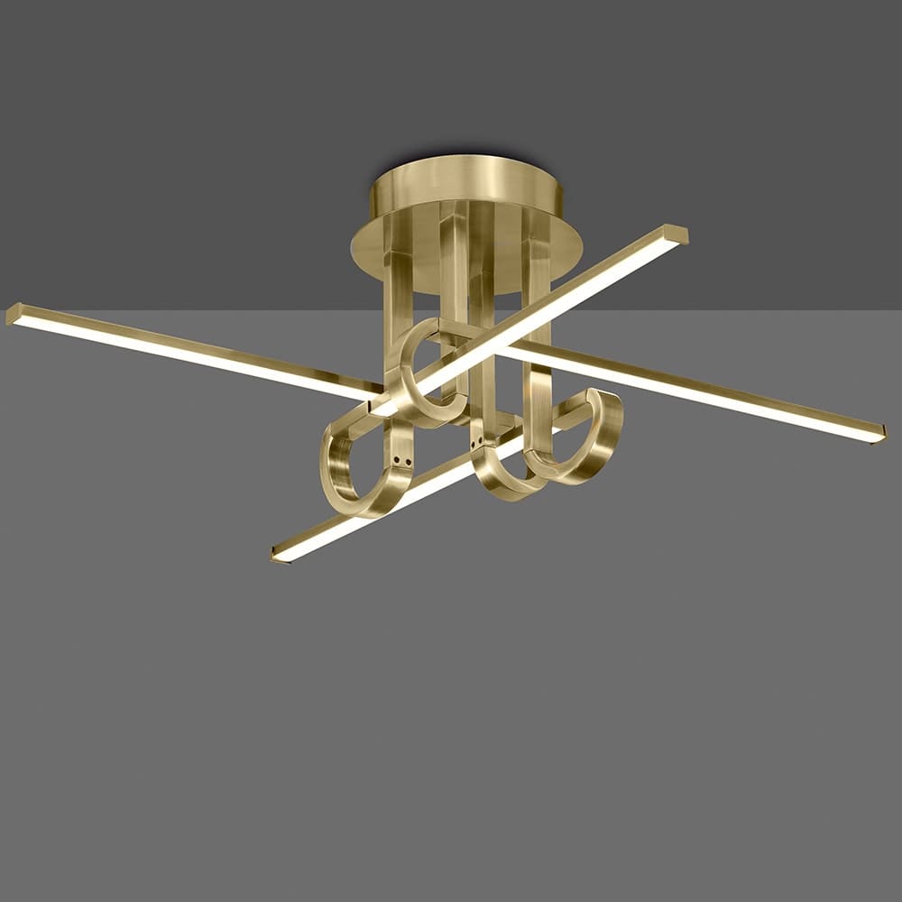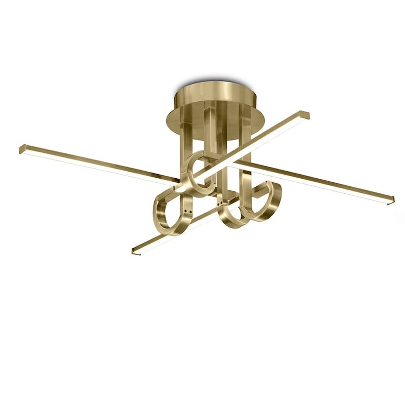 Der Cinto 4-Light Semi-Flush in Antikmessing verfügt über einen schlanken, modernen Rahmen aus Schleifen und Bögen mit integrierten LED-Leuchten, die in den dünnen linearen Linien eingeschlossen sind. Passende Beschläge erhältlich. Auch in Chrom erhältlich.