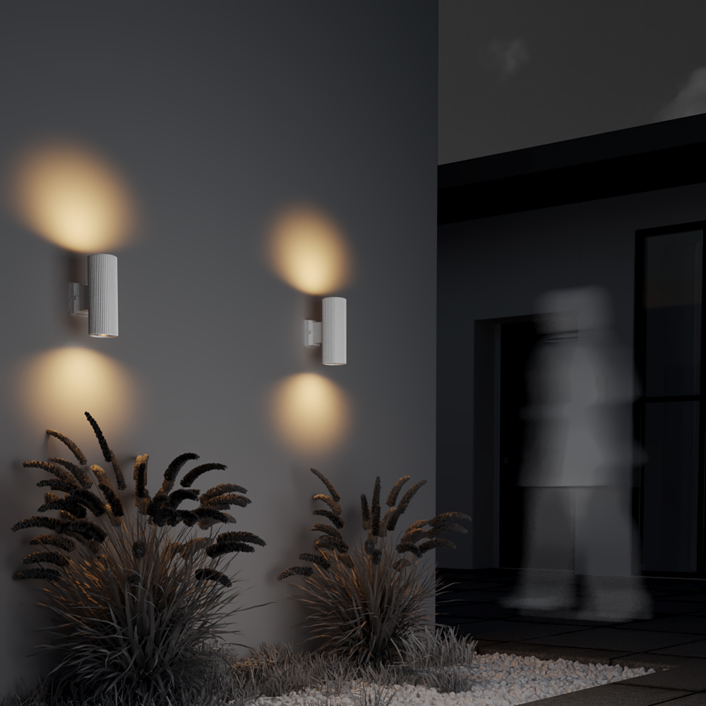 Die Außen-Wandleuchte Rando von Maytoni vereint modernes Design mit funktionaler Langlebigkeit. Gefertigt aus hochwertigem, lackiertem Aluminium in Weiß, Grau oder Schwarz, überzeugt sie durch ihr elegantes zylindrisches Design mit geriffelter Oberfläche.