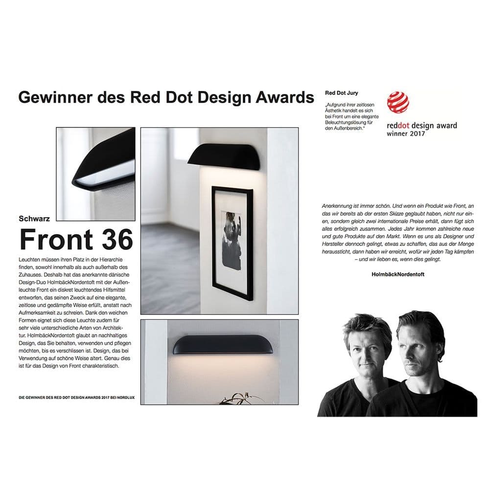 FRONT ist sowohl für die klassische Patriziervilla als auch das moderne Architektenhaus konzipiert. Die Leuchte ist aus Aluminiumguss gefertigt, wodurch ihre schlichte und klare Formensprache unterstützt wird. Dies bewirkt, dass FRONT sich ganz natürlich in die Architektur des Heims fügt. Es bewirkt aber auch, dass FRONT ihre Aufgabe als Licht- und Stimmungsspender mit größter Leichtigkeit erfüllt. Eine zeitgemäße Lösung mit energieeffizienter LED-Technik. Design by HolmbäckNordentoft.Leuchtenserie FRONT ist in zwei verschiedenen Farben und zwei Größen erhältlich. Jede Leuchte ist mit einem leistungsstarken LED-Leuchtmittel in warmweiss bestückt.