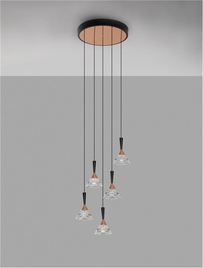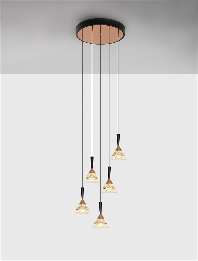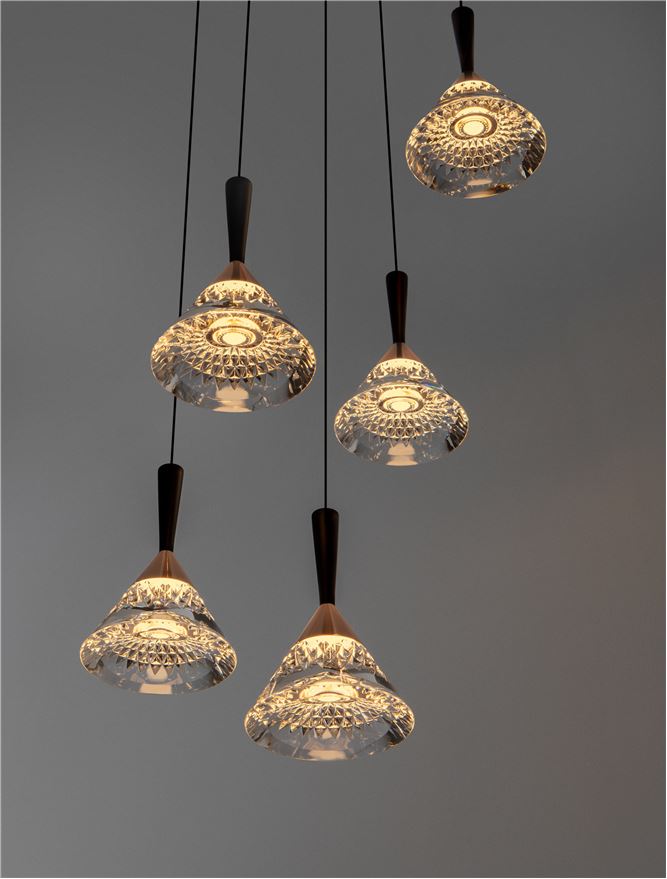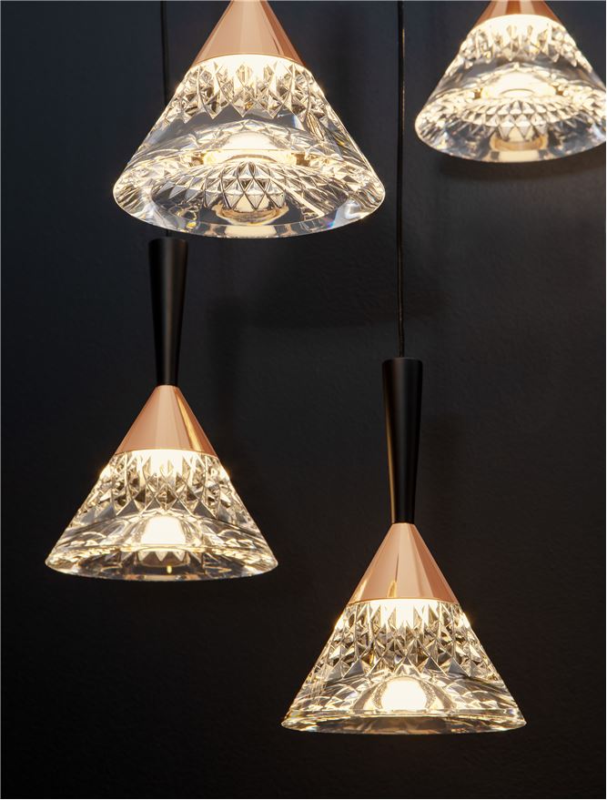 La suspension LED Paluz à 5 lampes allie design moderne et élégance raffinée. Avec sa finition noire et or rosé ainsi que son corps rond de 32 cm de diamètre, elle devient un élément décoratif incontournable. Équipée de 5 LED intégrées (30 W au total), elle diffuse une lumière blanc chaud de 3000 K créant une ambiance chaleureuse et accueillante.