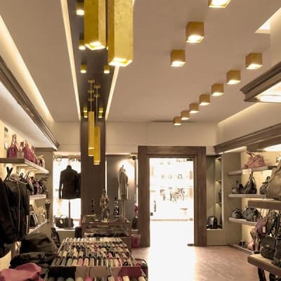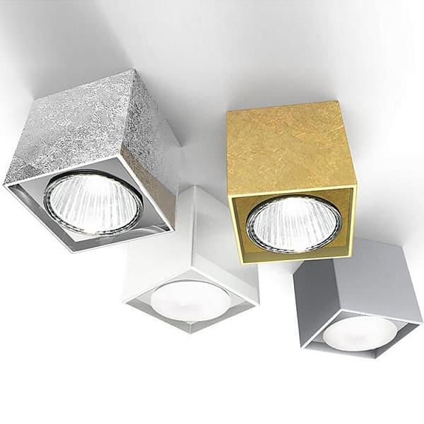 LED-Hänge- und Deckenleuchten aus viereckigem Aluminiumrohr in den Farben: Weiß, Schwarz, Bronze, satiniertes Messing und Goldblatt.