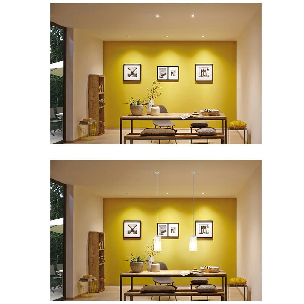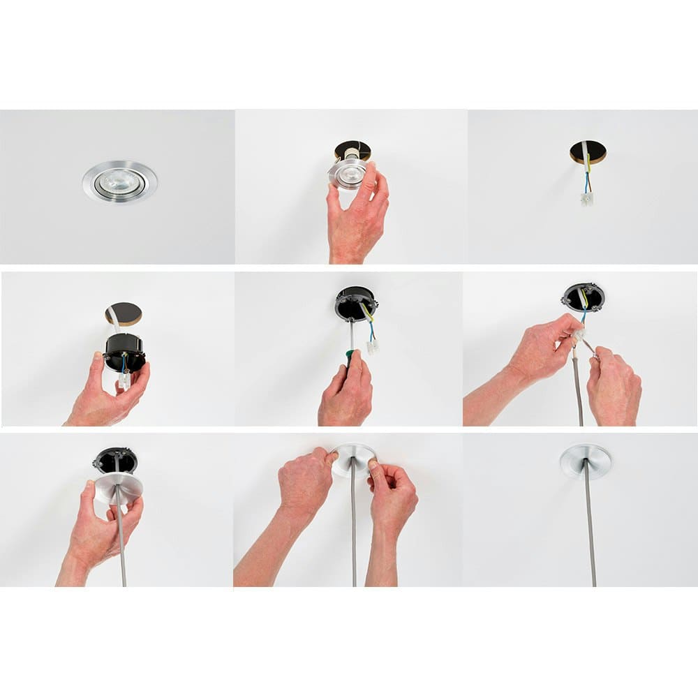 Häufig fehlt in einer Decke mit Einbauleuchten ein Stromauslass, an dem eine Pendelleuchte montiert werden kann. Der Pendeladapter lässt sich in Bohrlöcher mit einem Durchmesser von 68 Millimetern einsetzen, sodass der Anschluss eines Pendels problemlos möglich ist. Das Kabel wird einfach durch das Loch in der Mitte geführt und im Hohlraum in der Decke an das Stromnetz angeschlossen.
