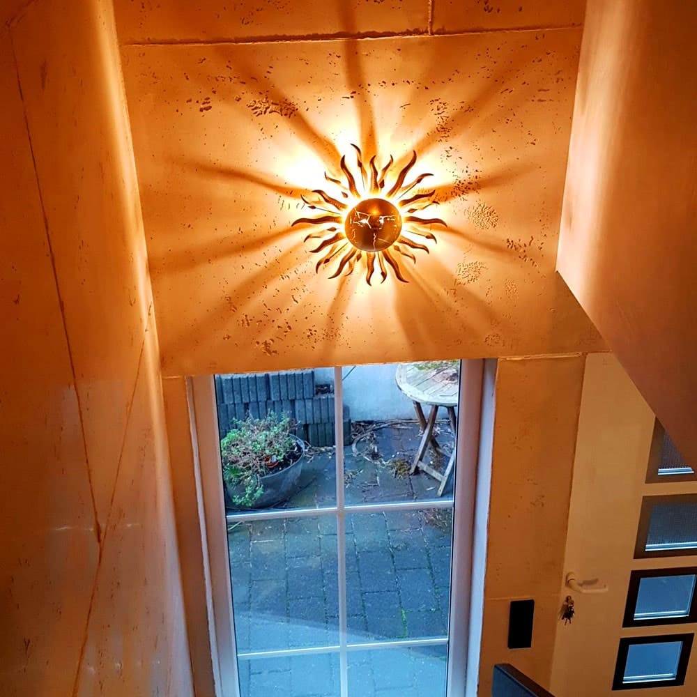 Die Sonnenleuchte macht mit ihrem unverwechselbaren Design in nahezu jeder Umgebung eine gute Figur. Nutzen Sie die Wandleuchte im Vintage-Design um ihre Wände und Decken mit den wundervollen Lichteffekten in Szene zu setzen. Bringen Sie ein gemütliches und stimmungsvolles Ambiente in Ihre Wohn- und Schlafräume, den Eingangsbereich oder nutzen Sie die Leuchte als stimmungsvolle Ambientebeleuchtung in Restaurants und Hotels.
