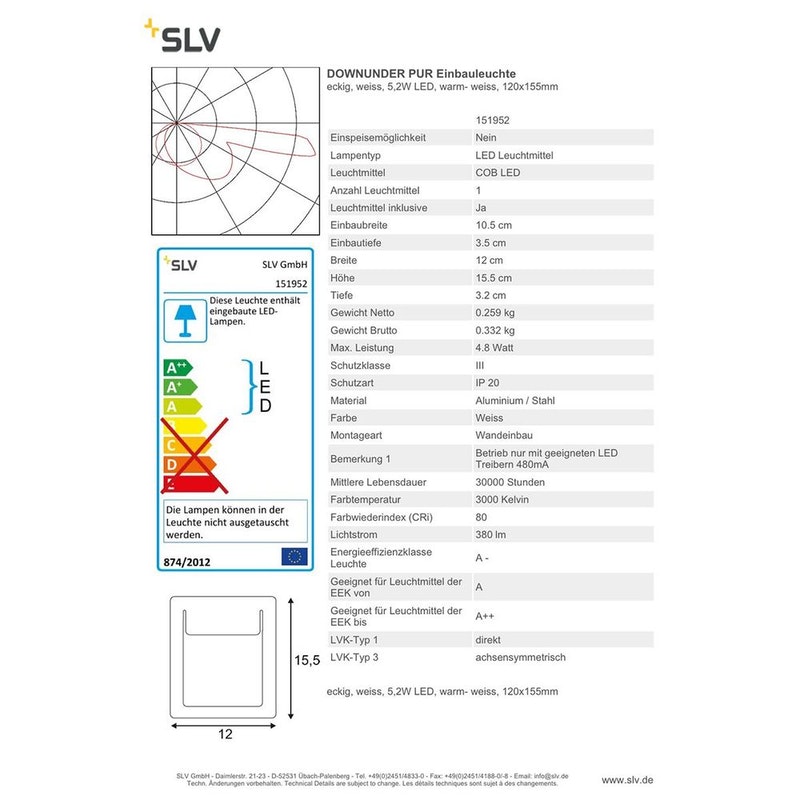 Die DOWNUNDER PUR 120 Einbauleuchte ist in einer weißen Gehäusefarbe erhältlich. Zur Inbetriebnahme der Einbauleuchte wird ein passender LED-Treiber mit 480mA benötigt. Optional ist ein Einbaurahmen für die Montage in Mauerwerk erhältlich. Bitte beachten Sie, dass diese Leuchte eingebaute LED-Lampen enthält und die Lampen nicht ausgetauscht werden können. Energieeffizienzklasse: A – A++.