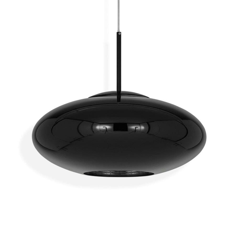 Der Schirm der Copper-Pendelleuchte erscheint in zeitlosem Schwarz, eine monochrome, glatte Kugel mit metallisiertem Aluminium im Inneren.