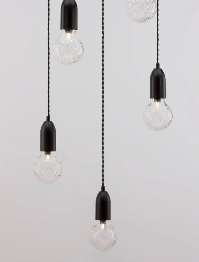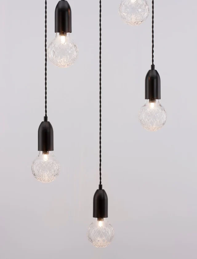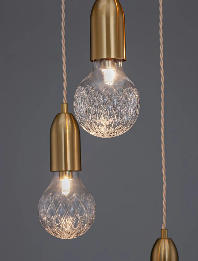 Jeder Schirm besteht aus handgeschliffenem Glas, das das Licht der G9-Leuchtmittel (nicht enthalten) sanft bricht und ein atmosphärisches, streuendes Umgebungslicht erzeugt. Die dezenten Aluminiumfassungen sind mit einem eingravierten Zierlogo versehen und verleihen der Leuchte zusätzliche Raffinesse.