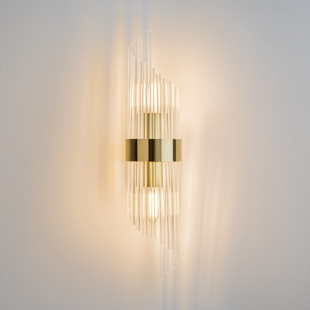 Die FRAME Wandleuchte von Maytoni ist ein wahres Highlight für stilvolle Interieurs. Das filigrane Gestell aus vergoldetem Metall in Kombination mit klarem Glas verleiht der Leuchte eine luxuriöse Leichtigkeit und macht sie zum Mittelpunkt jedes Raumes.