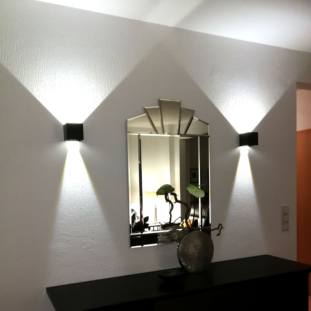 Ob ein feiner Strahl nach oben und ein breiter Lichtkegel nach unten oder eine asymmetrische Anordnung – alles ist möglich und einfach zu verändern, auch nach der Montage.