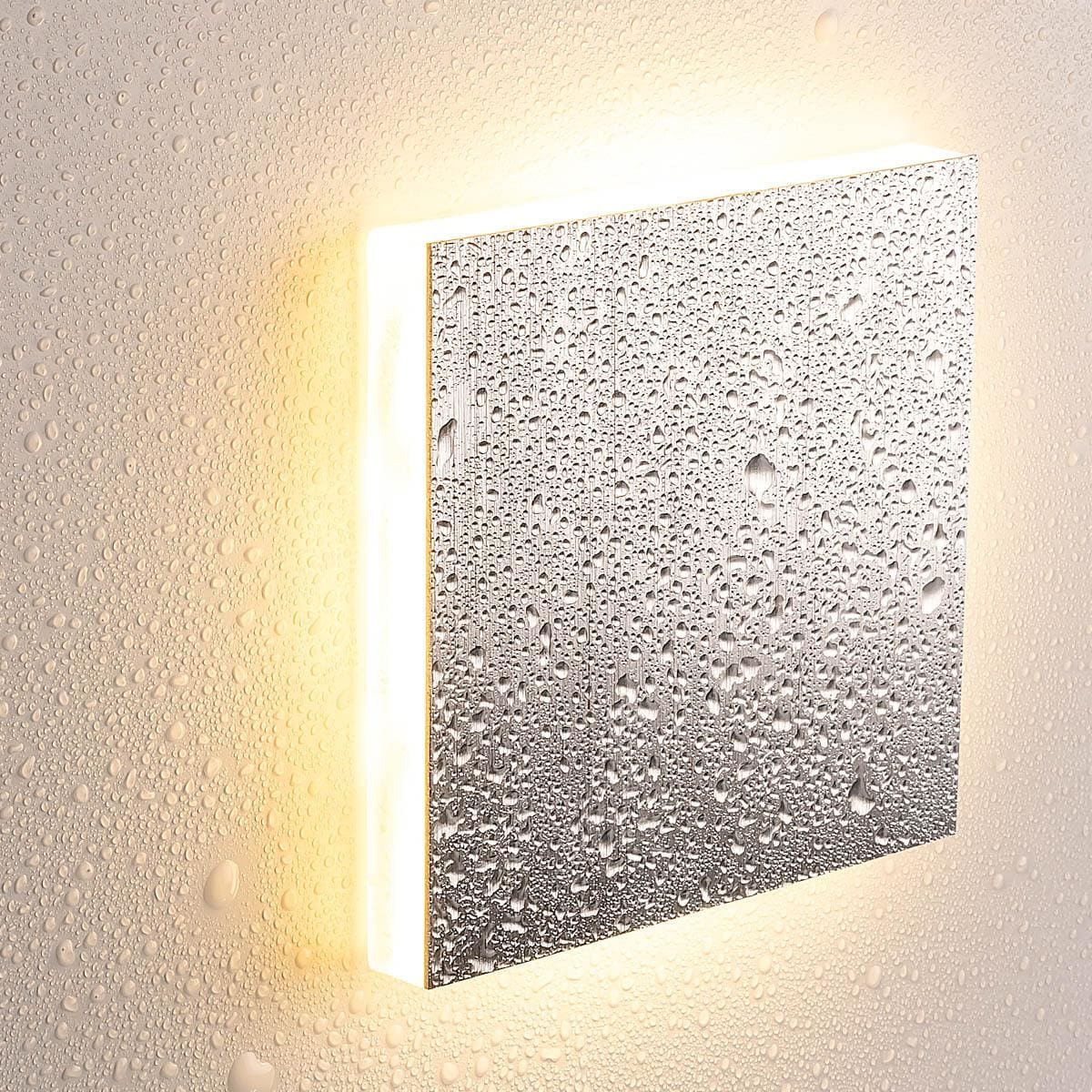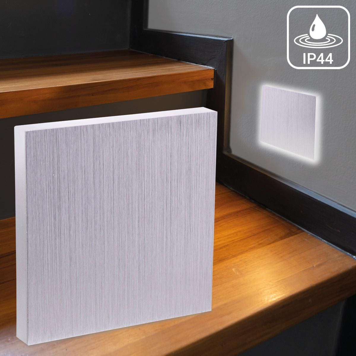Eclairage escalier LED carré IP44 blanc chaud 1,5W Alu brossé Inclus: Partie inférieure avec éclairage LED à économie d’énergie Partie
