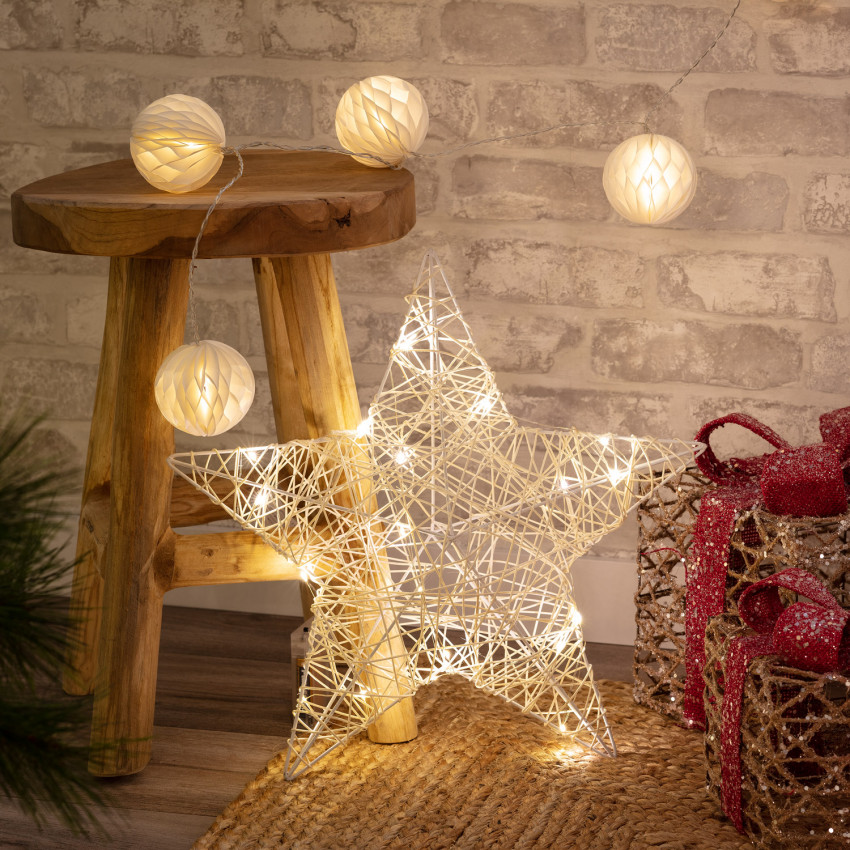 L’étoile se compose de mailles d’herbes marines naturelles et est équipée de lampes LED blanc chaud. La lumière peut être facilement allumée, éteinte et atténuée à l’aide de la télécommande fournie. L’autonomie de la batterie est de 6 à 20 heures-lumière, selon le mode utilisé.
