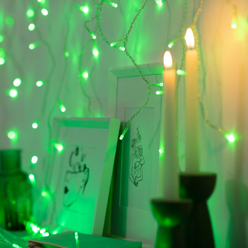 Guirlande LED Rideau sur une base de 2 mètres de long. Ses chaînes suspendues de lumières suivent une série mesurant
