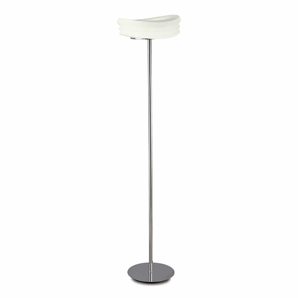 Une tige mince en chrome poli élève un abat-jour en verre opale aux bords arrondis et lisses, créant une réplique artistique des vagues ondulées. La simplicité élégante du design met en valeur l’esthétique contemporaine tout en évoquant la beauté apaisante de la nature.