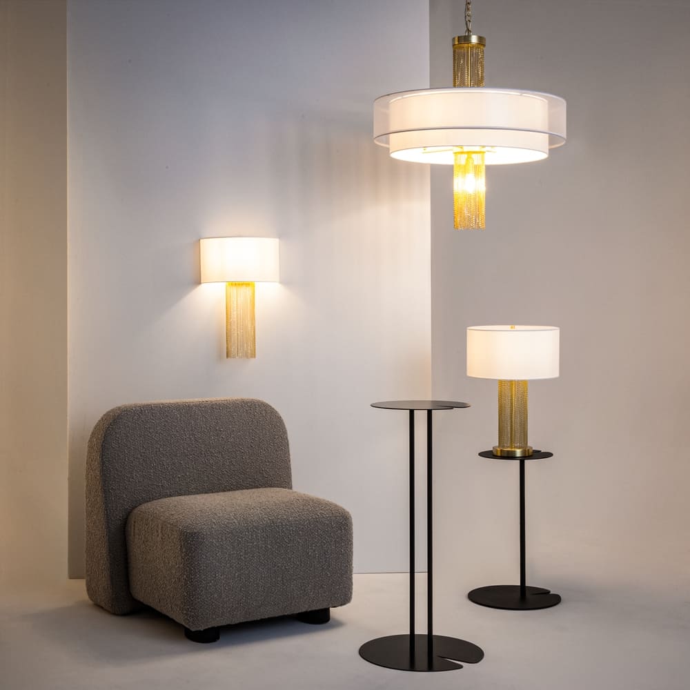 - Matériaux de haute qualité : L’abat-jour est en tissu blanc, harmonieusement associé aux chaînes décoratives dorées pour un look sophistiqué.