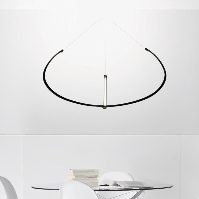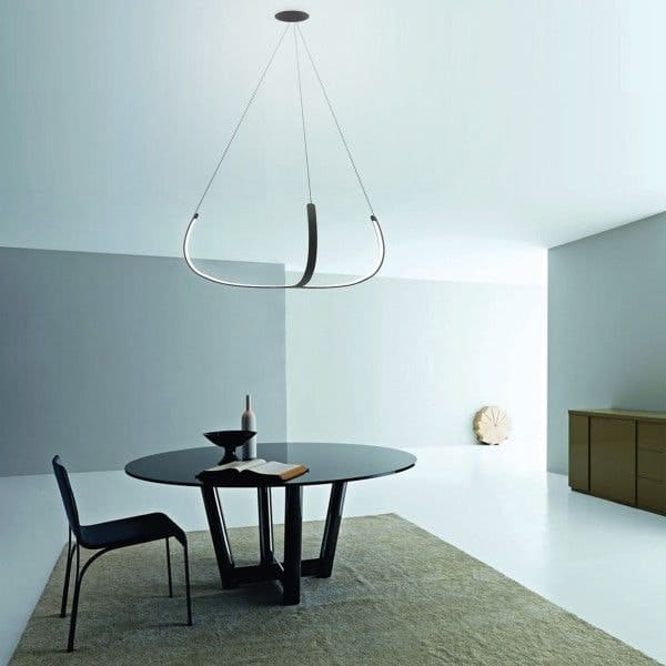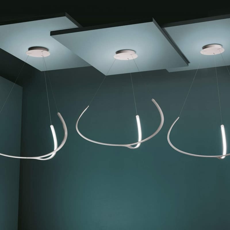 Suspension LED légère pour 70% d’up light et 30% de down light, bras en aluminium extrudé, corps central en aluminium moulé sous pression, diffuseur en méthacrylate blanc opale. Disponible en blanc mat ou noir mat. Disponible également avec télécommande.