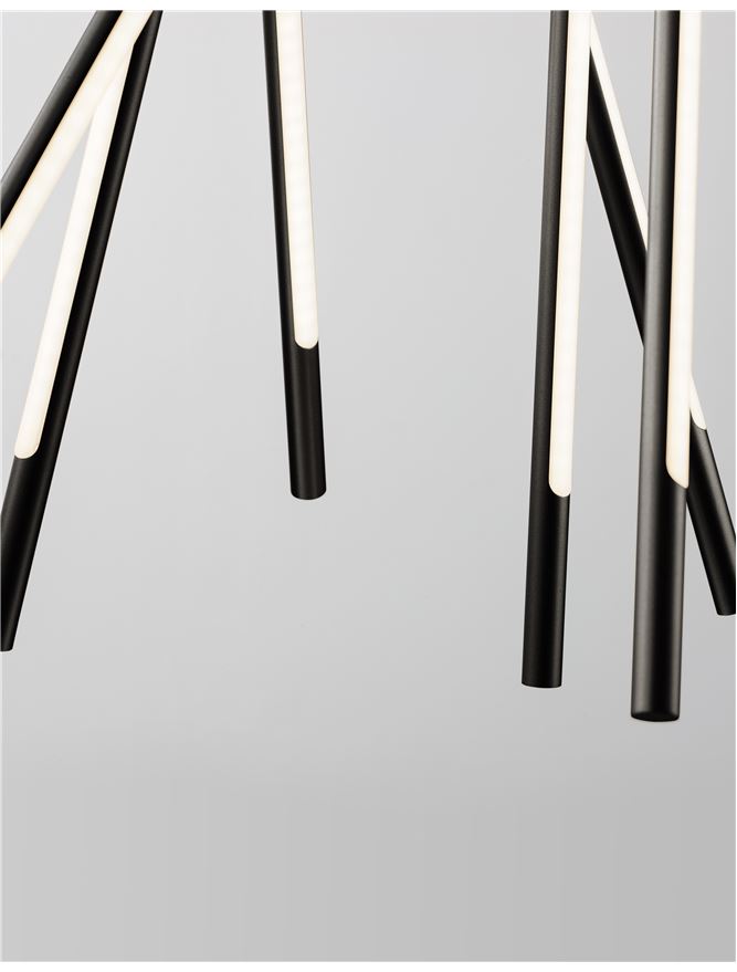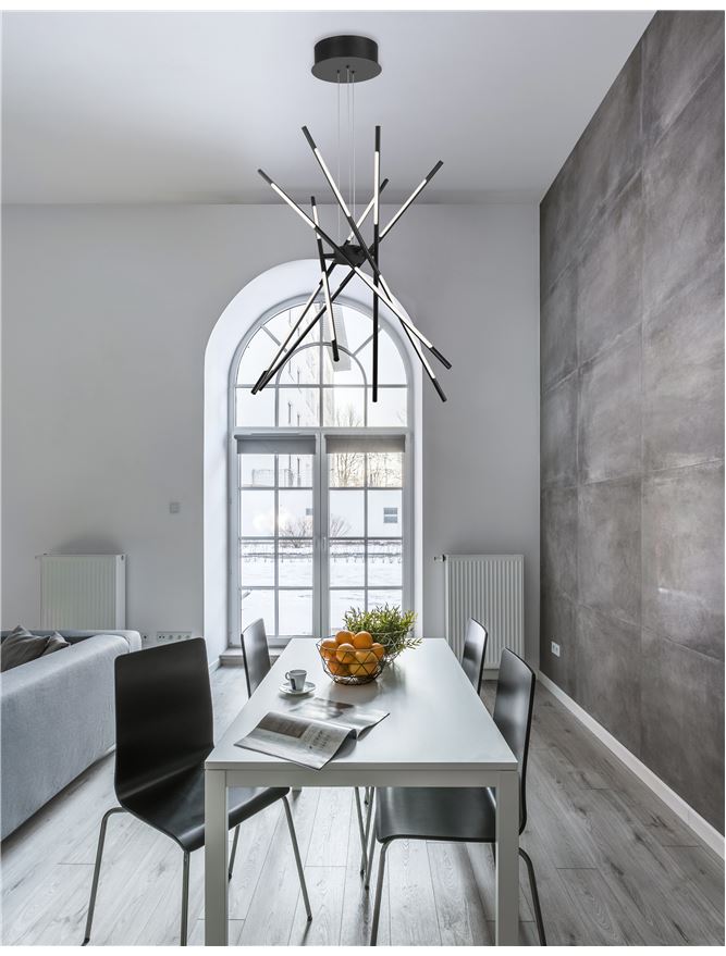 La suspension LED RACCIO 68W noir 85 cm de Nova Luce incarne l’alliance parfaite entre design architectural moderne et performance lumineuse élevée. Sa structure graphique en métal noir associée à un diffuseur en acrylique en fait un véritable élément décoratif au-dessus d’une table à manger ou dans un salon contemporain.
