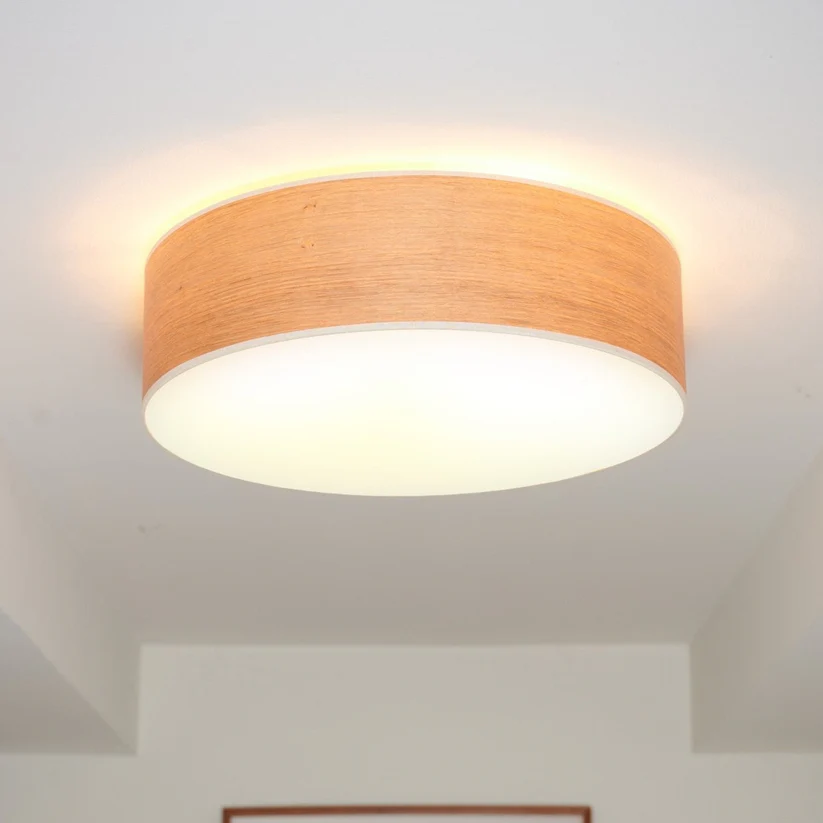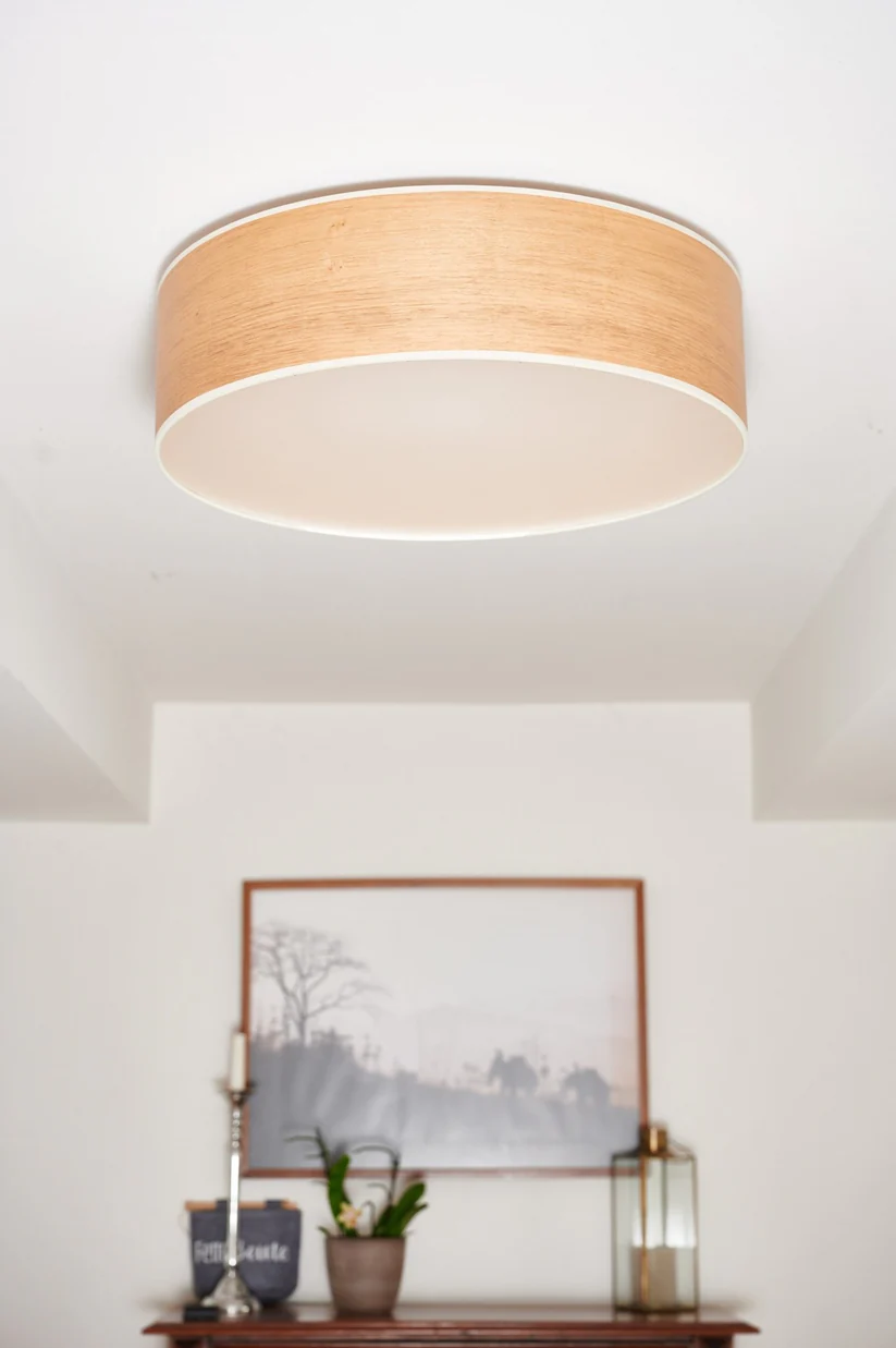 Grâce à son diffuseur circulaire, la lumière est uniformément répartie dans la pièce, créant une atmosphère chaleureuse et tamisée. Selon la taille, la lampe est équipée de deux ou trois douilles E27, permettant un éclairage suffisamment intense pour des zones comme les salons ou les grandes tables à manger. Le pourtour textile sur le haut et le bas du luminaire souligne la finition soignée.