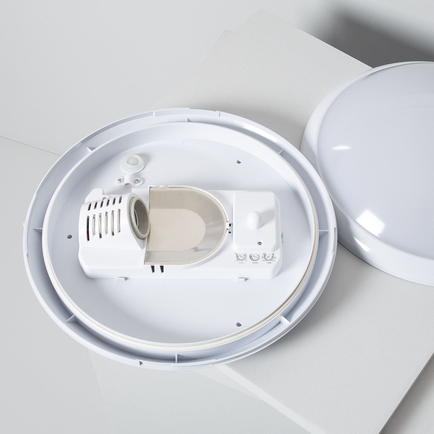 Vous pouvez ajuster le fonctionnement du plafonnier selon votre besoin et en fonction de divers paramètres comme la distance de détection (1-8 mètres de rayon) ou le temps d’allumage entre 10 (±3) secondes et 12 (± 1) minutes. Il a une vitesse de détection de 0,6-1,5 m/s et un détecteur lumineux qui détermine s’il doit être allumé ou pas, en fonction de la lumière de la pièce.