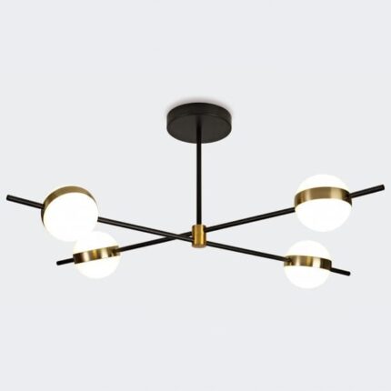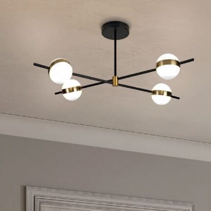 Le contraste harmonieux entre la base noire, la structure dorée et les sphères blanches crée un équilibre visuel élégant et contemporain. Le cadre agit comme une protection subtile autour des globes en verre, tout en conservant une grande légèreté visuelle.
