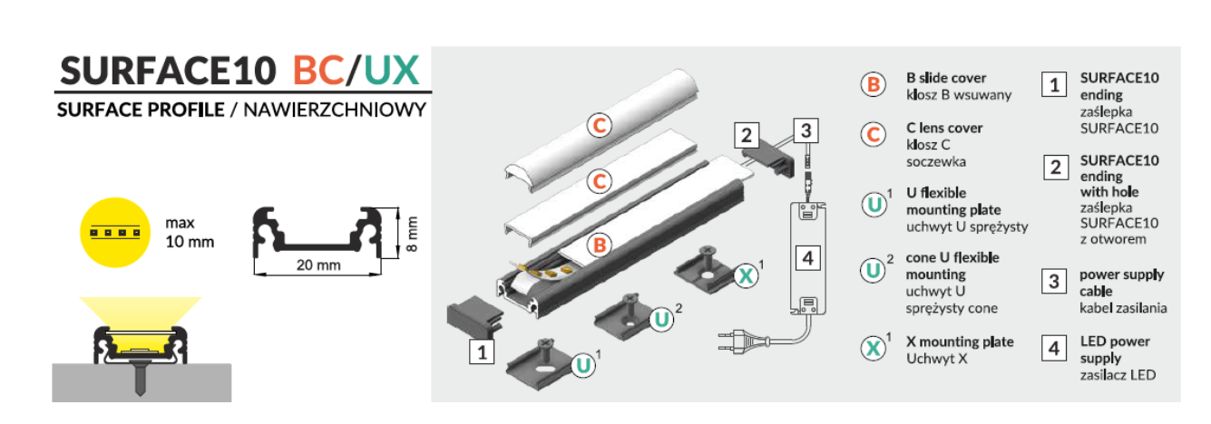 - Le profil de montage SURFACE sert de refroidissement passif et prolonge ainsi la durée de vie des rubans