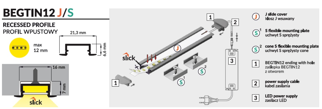 Il est idéal pour le montage sur rainure, mais aussi pour un montage libre sur des surfaces murales ou au plafond. Le profil d’installation plat pour bandes LED jusqu’à 12 mm de large est bien adapté pour une installation dans des murs plats. Il est disponible en longueurs de 100 cm et 200 cm.