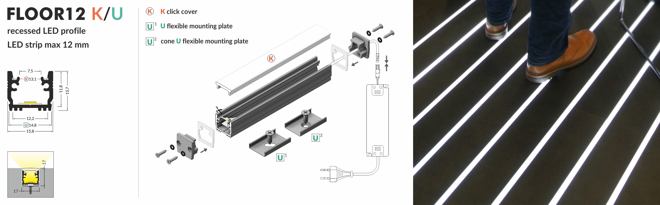 Le profilé est en aluminium de haute qualité et est disponible en version anodisée. Les bandes LED d’une largeur maximale de 12 mm conviennent comme source lumineuse.