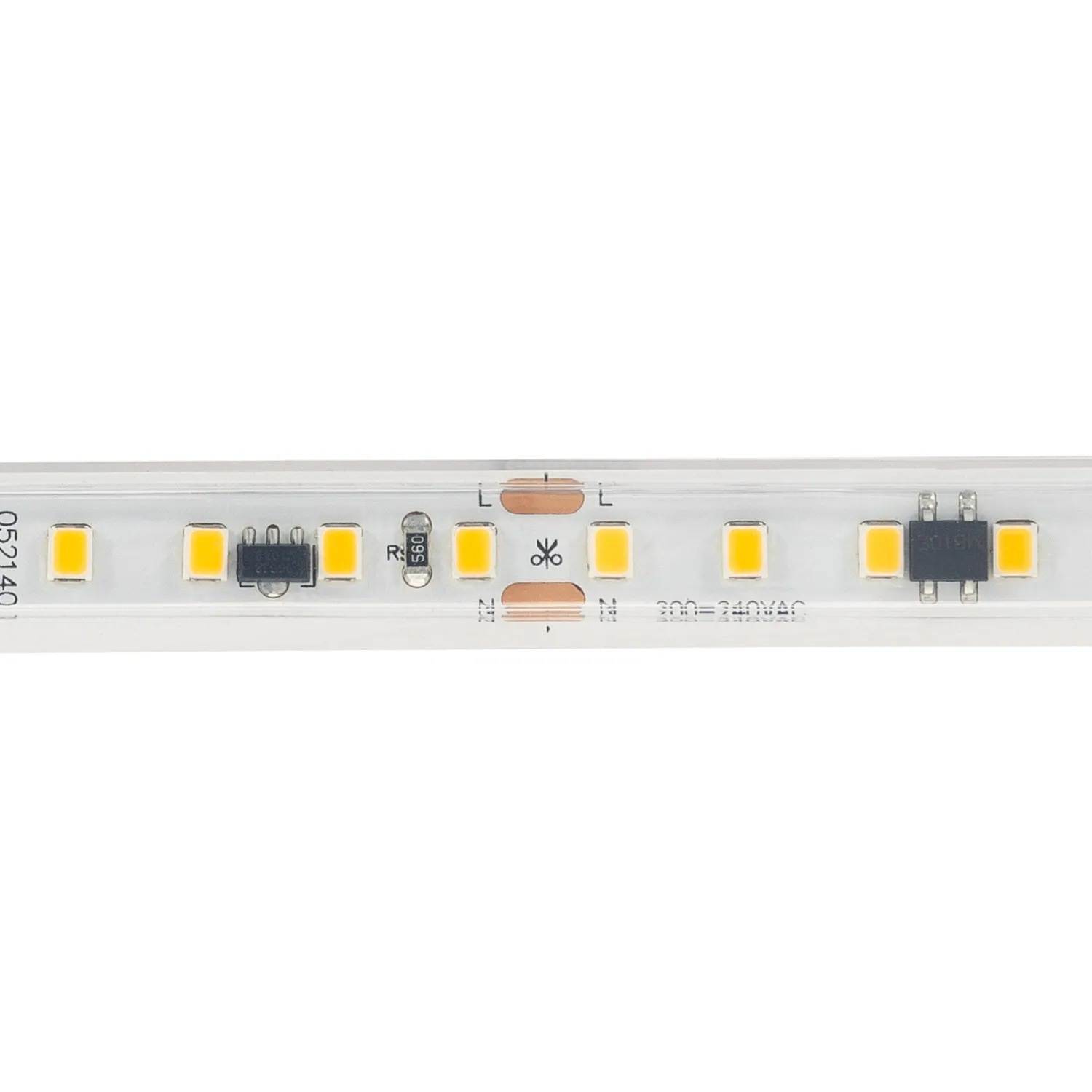 Le Ruban LED Dimmable 220V AC 120LED/m Blanc froid High Lumen sur mesure Largeur 12mm coupe tous les 10cm IP65 ne nécessite aucun type de rectificateur car elle se branche directement au secteur. Sa flexibilité lui permet de s’adapter à presque toutes les surfaces.