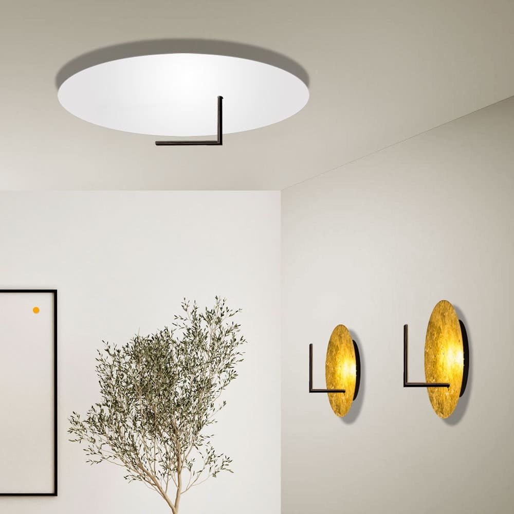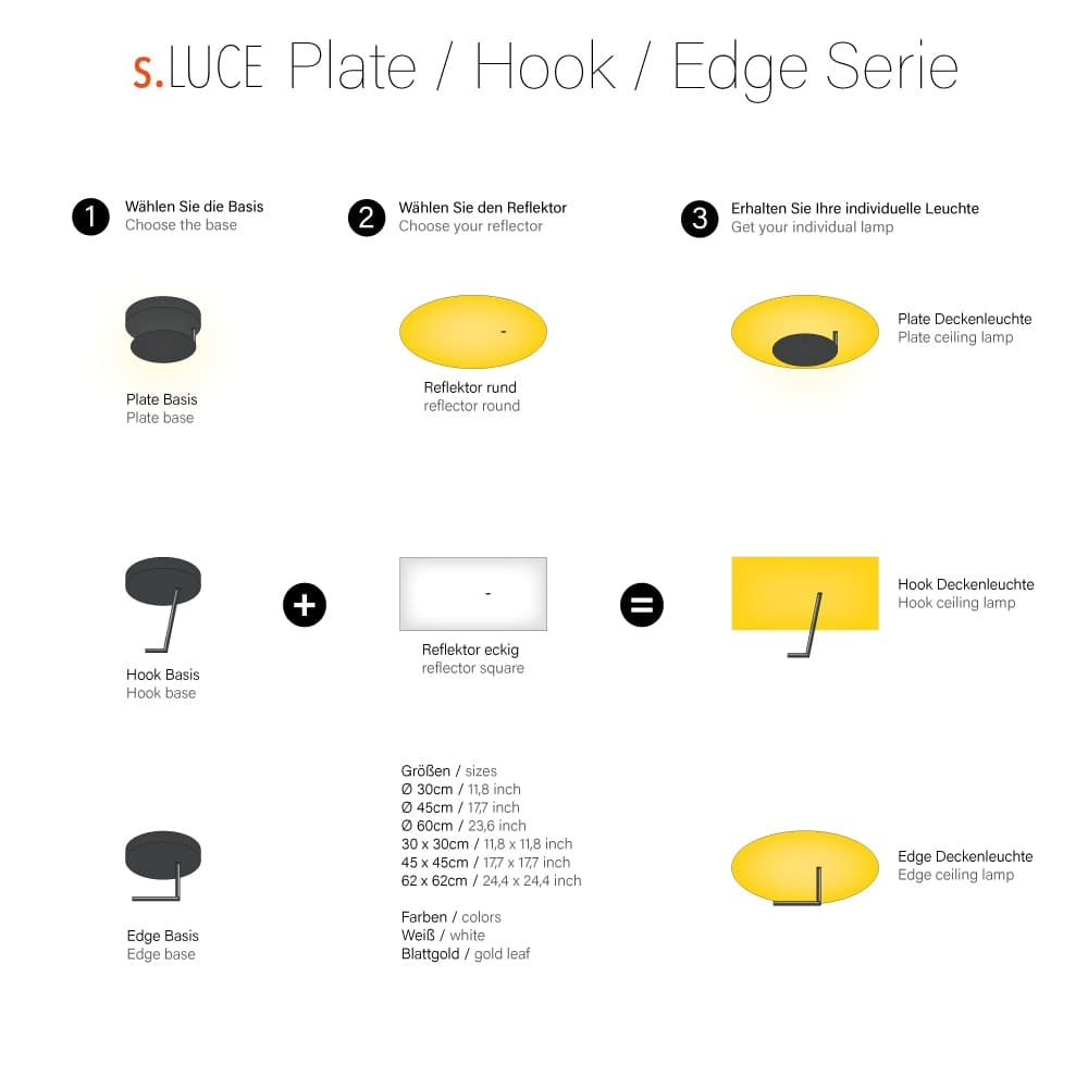 Le bras lumineux noir est parallèle à la plaque réflectrice et assure l’éclairage indirect caractéristique de la série s.LUCE Edge. La lumière frappe la plaque réflectrice blanche ou dorée à la feuille au choix et est réfléchie par celle-ci dans la pièce. Il en résulte une superbe atmosphère dans la pièce.